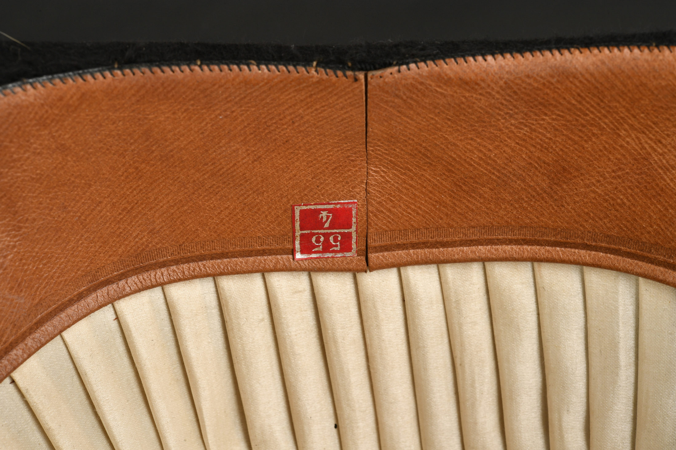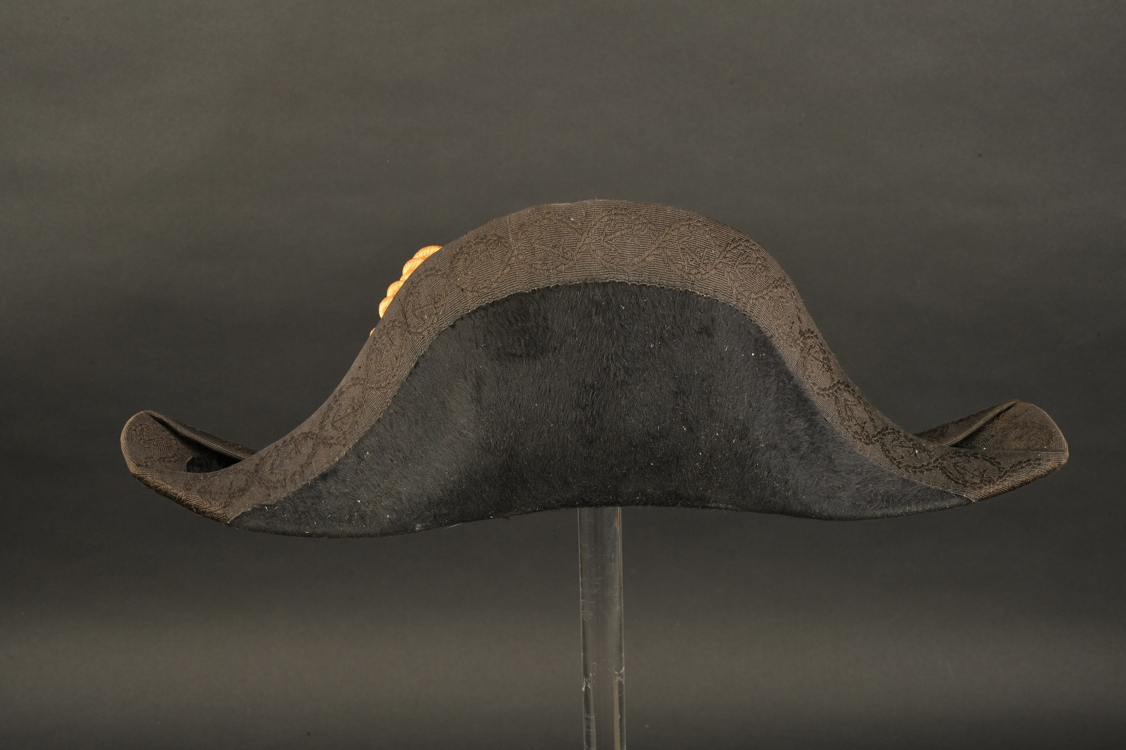 Bicorne de Polytechnicien. En feutrine noire. Galon or légèrement décousu. Bouton doré disposant de l’ancre de marine. Cocarde tricolore présente. Bandeau de transpiration en cuir marron, étiquette indiquant une taille 55 4. Intérieur doublé en satinette blanche. Fabrication Autier Toulon. A noter une certaine usure et patine de la pièce. Etat II+.