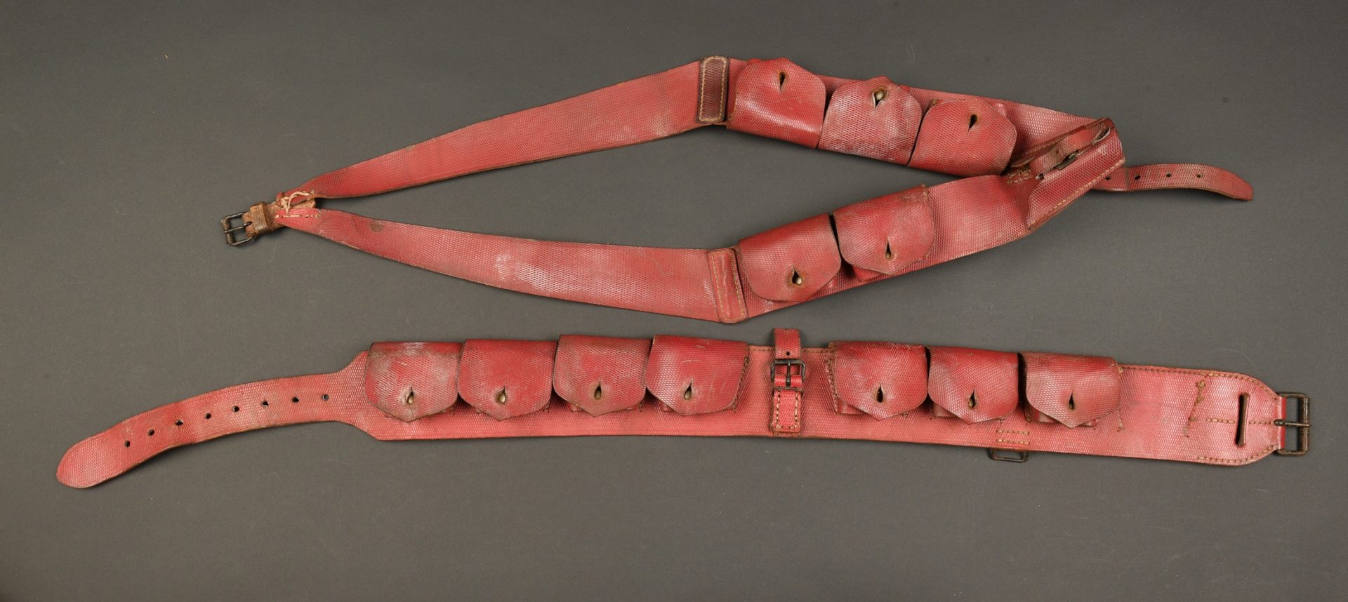 Ceinturon porte cartouches de Spahis. Baudrier modèle 1935 confectionné en cuir rouge gaufré possédant 5 compartiments pour lames chargeurs et un porte fourreau de baïonnette. Une réparation... en savoir plus