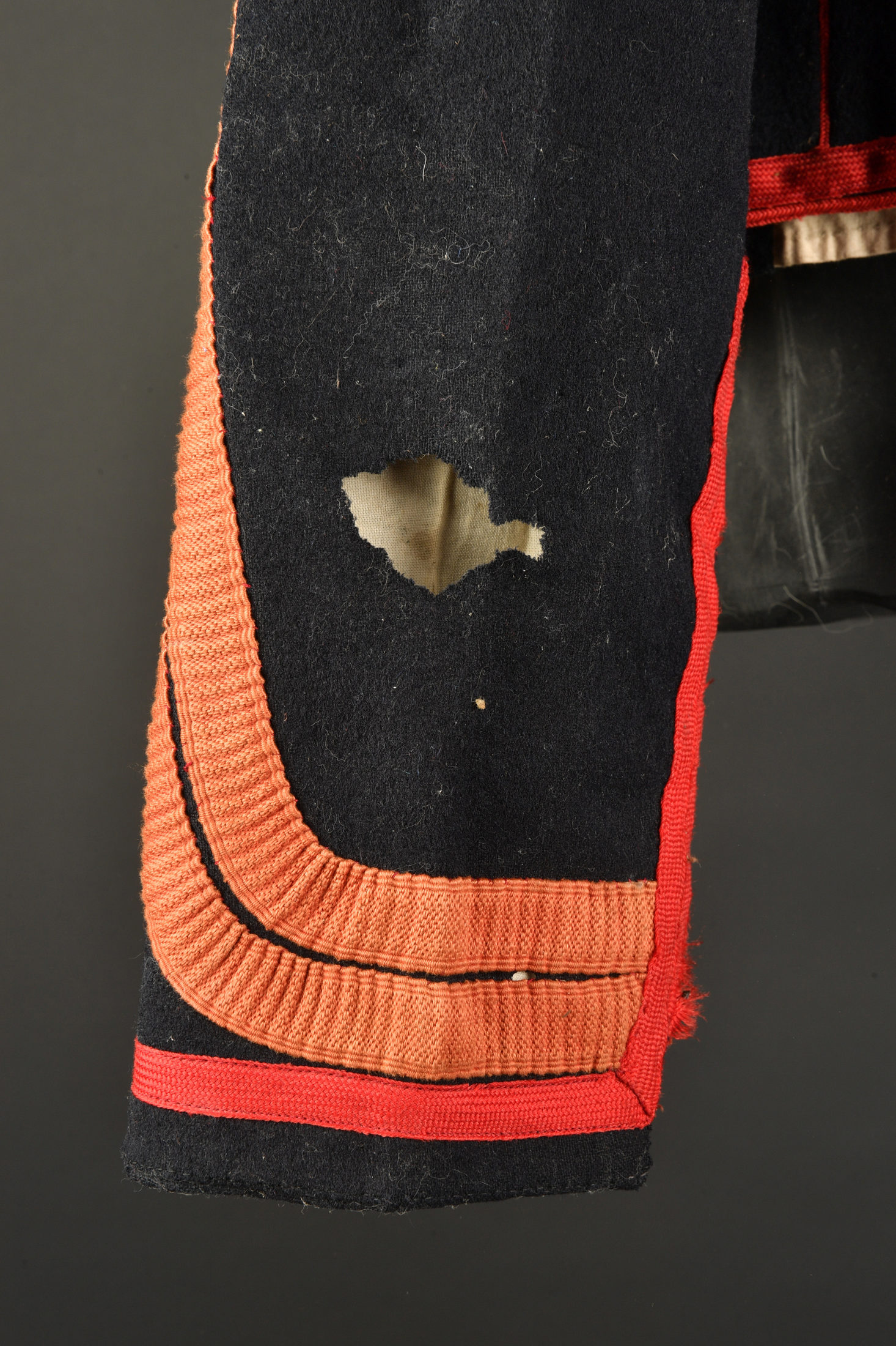 Ensemble d’uniformes du 3ème Régiment de Zouaves. Comprenant une veste de zouaves modèle 1879 modifiée 1893 du 3ème Régiment de Zouaves. Tombôs de couleur bleu foncé jonquille, modèle troupe réglementaire. Doublure en coton écru avec poche à pansement, ganse et tresse plate cousues d’origines, tampon de réception et de fabricant datés 1896. Un gilet modèle 1879 confectionné en drap bleu foncé, dos et doublure en coton écu daté 1914. Pattes de serrage et boutons présents. A noter plusieurs trous notamment un à la manche gauche.