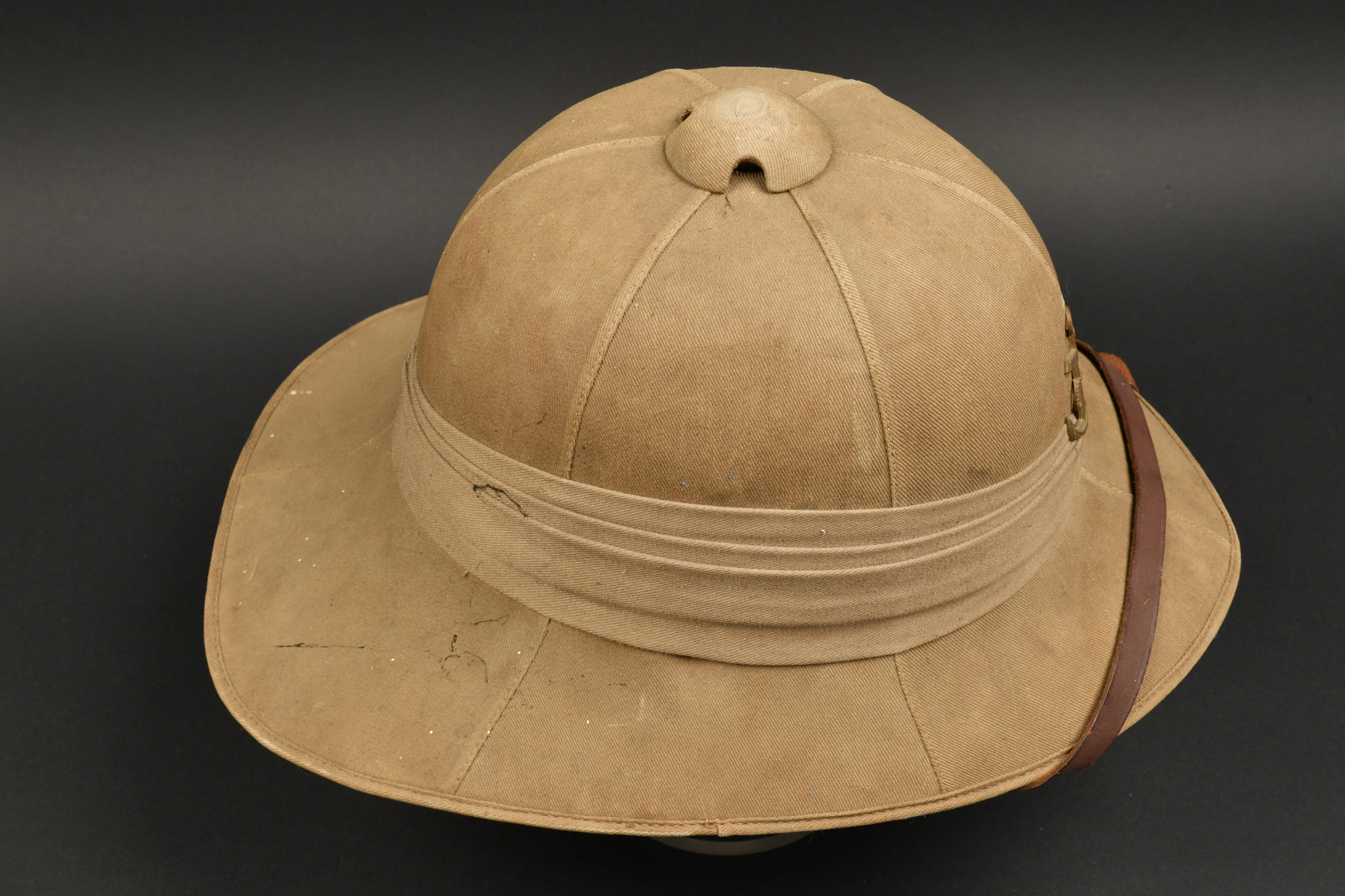 Souvenirs d’un tirailleur sénégalais à Madagascar. Comprenant un fanion de bataillon de tirailleurs sénégalais de renfort, sur une face est représenté un tirailleur brodé en coton avec en arrière plan une croix de Lorraine ainsi que les mentions BTSR N°1, 3ème compagnie Engin. Sur l’autre face sont brodées les noms des batailles auxquelles a participé le bataillon ainsi que la mention Madagascar 47/48. Fanion fixé sur une lance en bambou de fabrication locale. Dimensions 59x22cm. Un képi d’un adjudant de l’infanterie coloniale de fabrication après guerre, ancre brodée cannetille, boutons à l’ancre coloniale, pourtour cassé, étiquette du tailleur REY au fond du képi. Un casque colonial anglais, tampon du War Department sur le bandeau avec la lettre O, jugulaire présente ainsi qu’une ancre coloniale française en laiton. Un lot d’environ 40 photos civiles et militaires. On y joint divers insignes portés par le soldat au cours de sa carrière dont son insigne du bataillon autonome du Niger de l’Ouest de fabrication Drago Béranger à dos guilloché, insigne tissu Rhin et Danube tissé et brodé et des pattes d’épaules de l’infanterie coloniale.