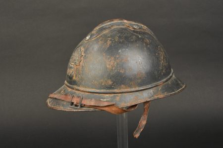 Casque Adrian 1915 infanterie. Casque Adrian modèle 1915, peinture bleu nuit au pinceau recouvrant la peinture d’usine à 90%. Attribut de l’infanterie modèle 1915 en peinture d’origine. Quatre gaufrettes en aluminium, coiffe en cuir du second modèle en cuir havane, bandeau gris de fer bleuté. Jugulaire réglementaire dans sa longueur d’origine mais accidentée. Deux enfoncements sur le dessus de la bombe.