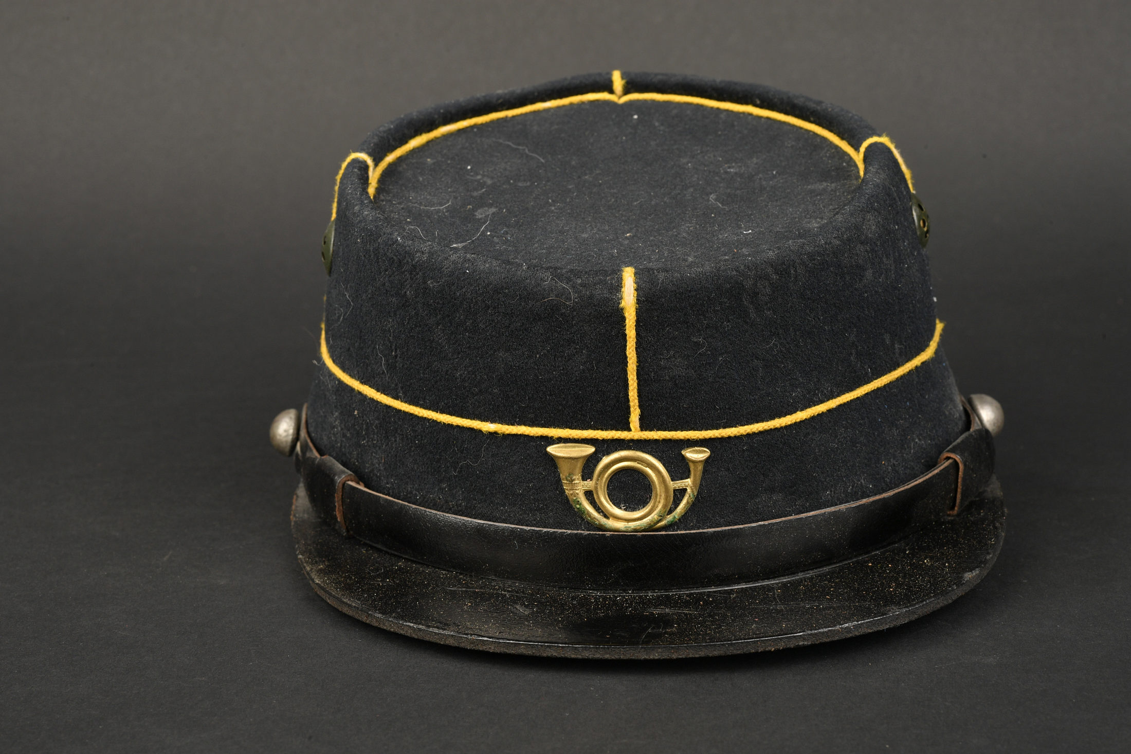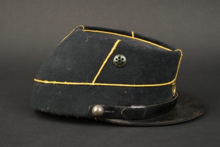 Ensemble divers. Comprenant une réplique de képi 1873 de chasseurs en drap bleu nuit, passepoil jonquille, corps de chasse rapporté en métal doré, marquage du tailleur au fond du képi. Une... en savoir plus