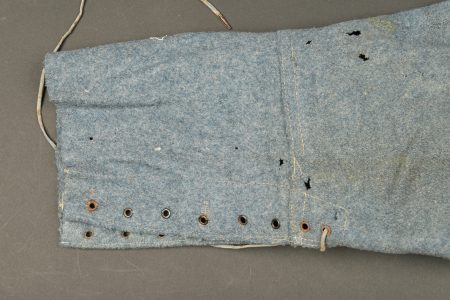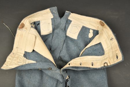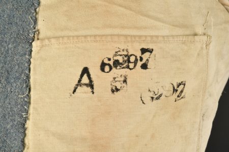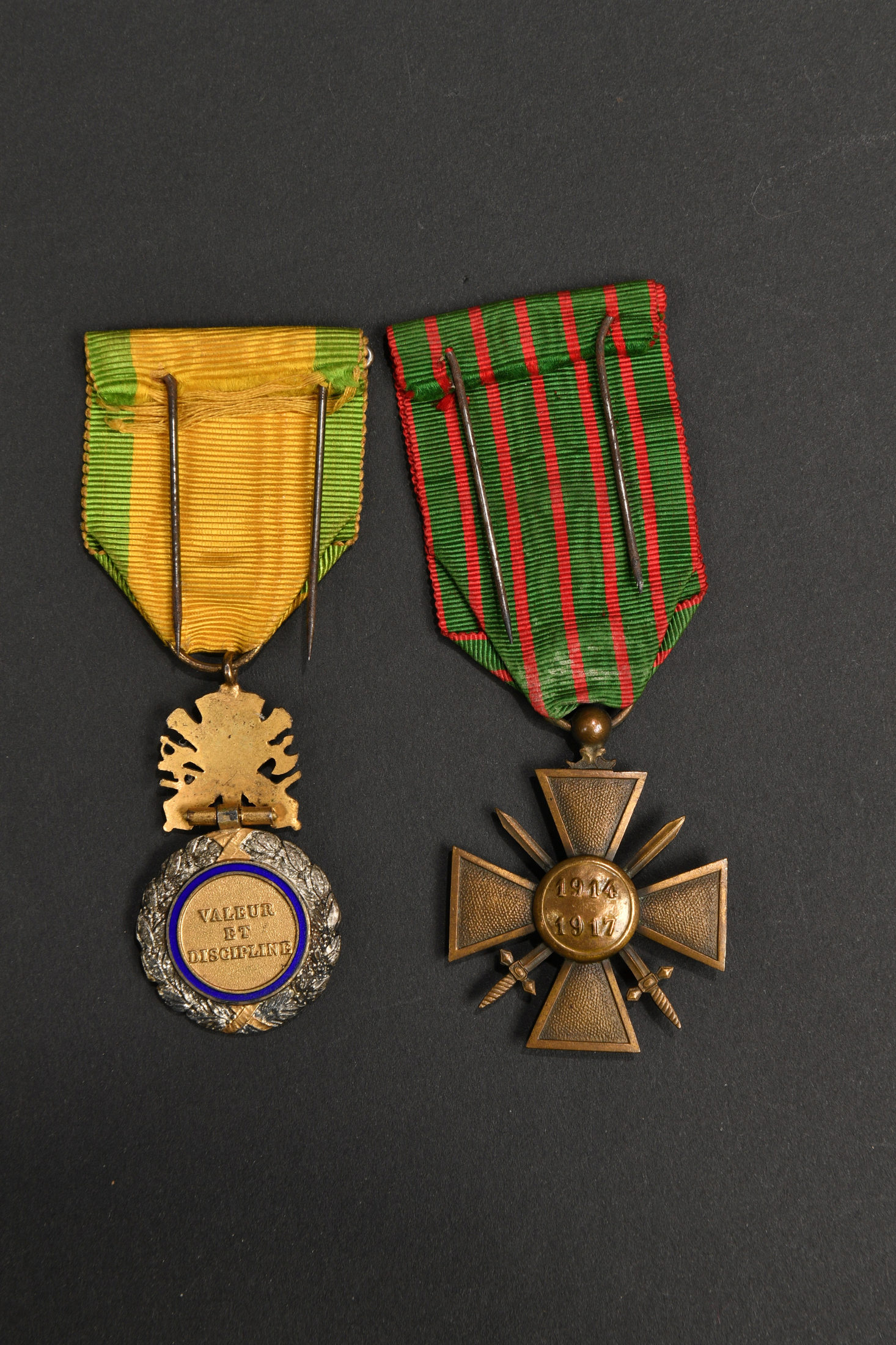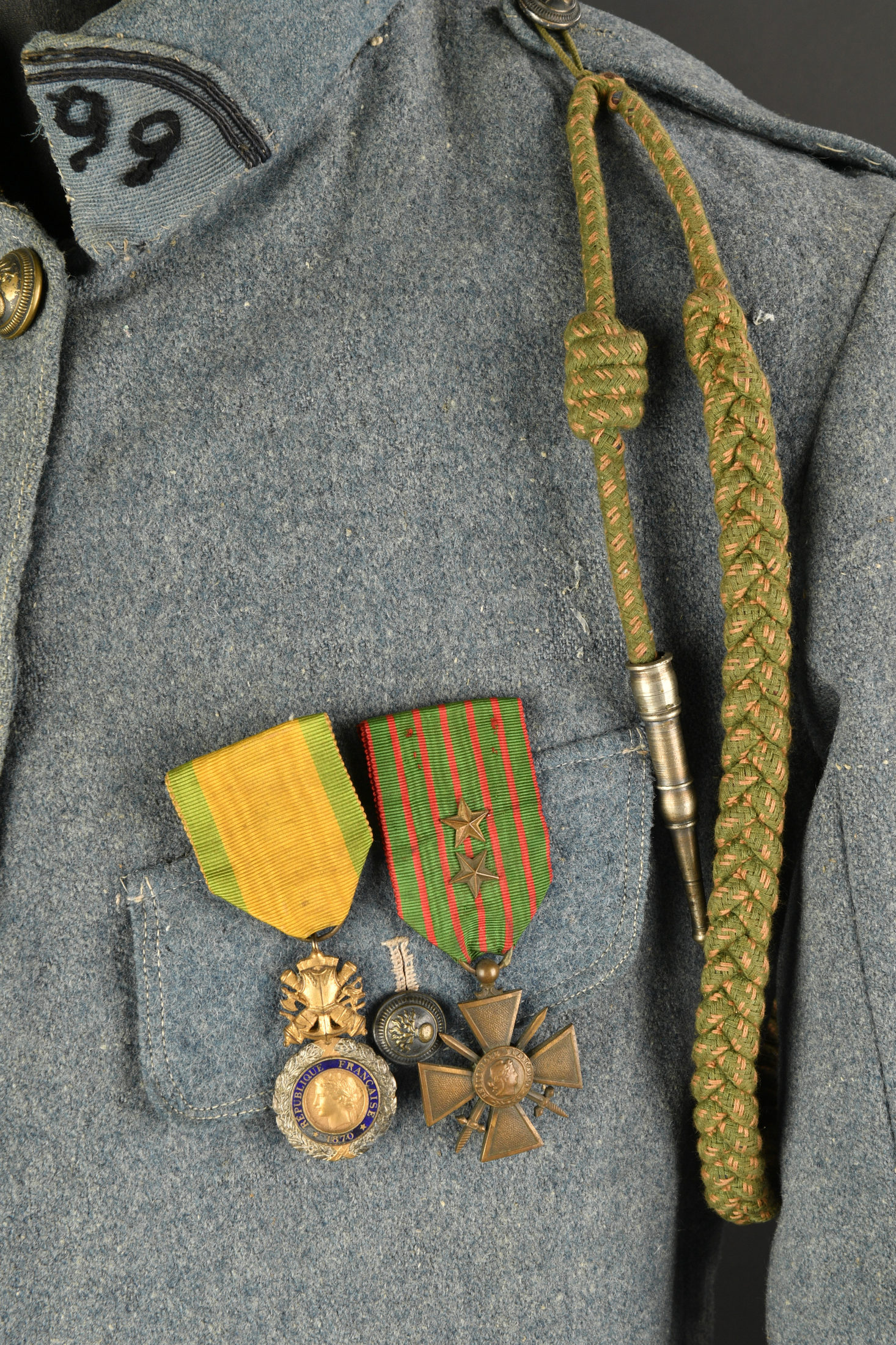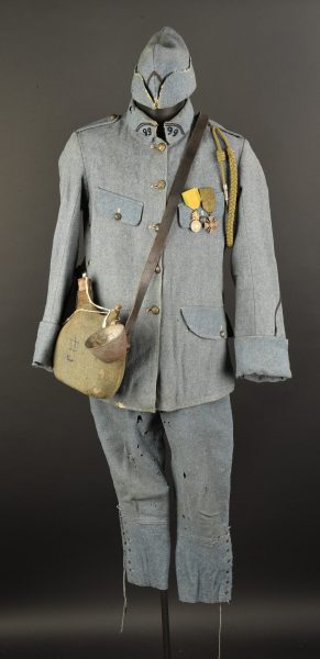 Ensemble d’uniformes du soldat Perraud. Comprenant une vareuse troupe modèle 1915 modifiée pour un sous officier par l’ajout de deux fausses poches de poitrine ainsi que d’un col demi saxe sur lequel est cousu des pattes de col troupe du 99ème Régiment d’Infanterie, vareuse se fermant par 5 boutons. Doublure en coton écru tamponnée du matricule du soldat ainsi que des marquages régimentaire du 159ème Régiment d’Artillerie à Pied sur la face interne de la doublure, grades de première classe cousus aux bas des manches, nombreux trous de mites. Une culotte modèle 1914 en drap bleu horizon, doublure en coton écru, tampon de réception présent mais date illisible, la plupart des boutons sont présents, manchettes en drap avec système de serrage par lacets, à noter de nombreux de mites et manques de drap. Une gourde modèle 1877 recouverte de drap bleu horizon, initiales du soldat entrelacées, courroie de transport en cuir présente et quart réglementaire. On y joint son bonnet de police en drap bleu horizon, passepoil décousu, galon de première classe ainsi que sa médaille de 1914 et sa médaille militaire.