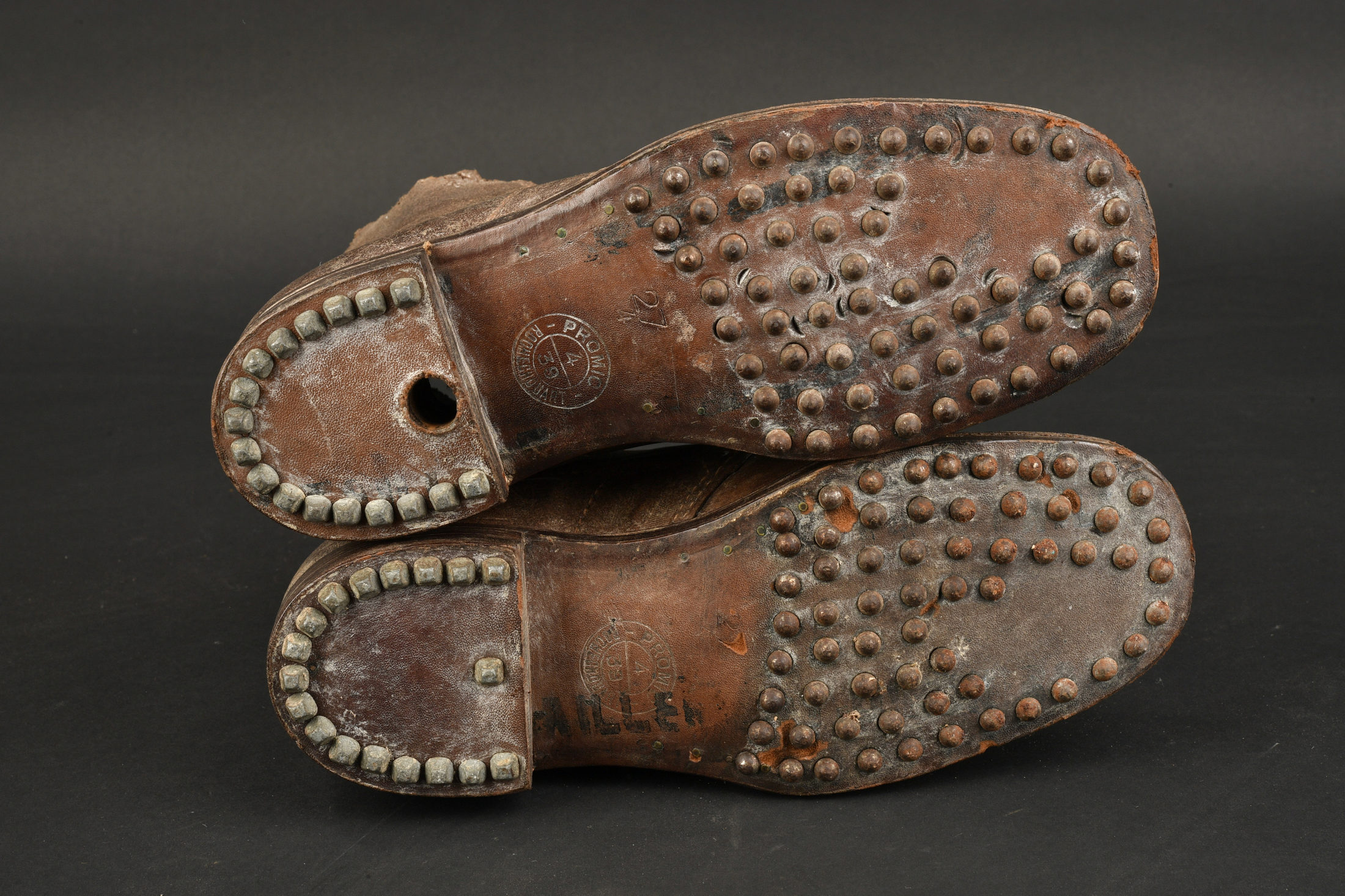 Paire de brodequins 1917.Paire de brodequins en cuir fauve modèle 1917, réceptionnés sur la semelle du 4ème trimestre 1939, taille 27-4. Sur les deux brodequins les rivets de renfort sont... en savoir plus