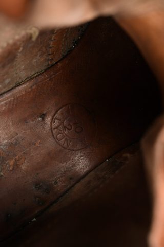Paire de brodequins 1917. Paire de brodequins en cuir fauve modèle 1917, réceptionnés sur la semelle du 2ème trimestre 1940, taille 29-4. Sur les deux brodequins les rivets de renfort sont... en savoir plus