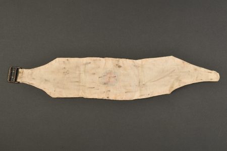Brassard PPF. Brassard du Parti Populaire Français, modèle précoce confectionné en coton blanc avec insigne rapporté en tissu. Usagé.