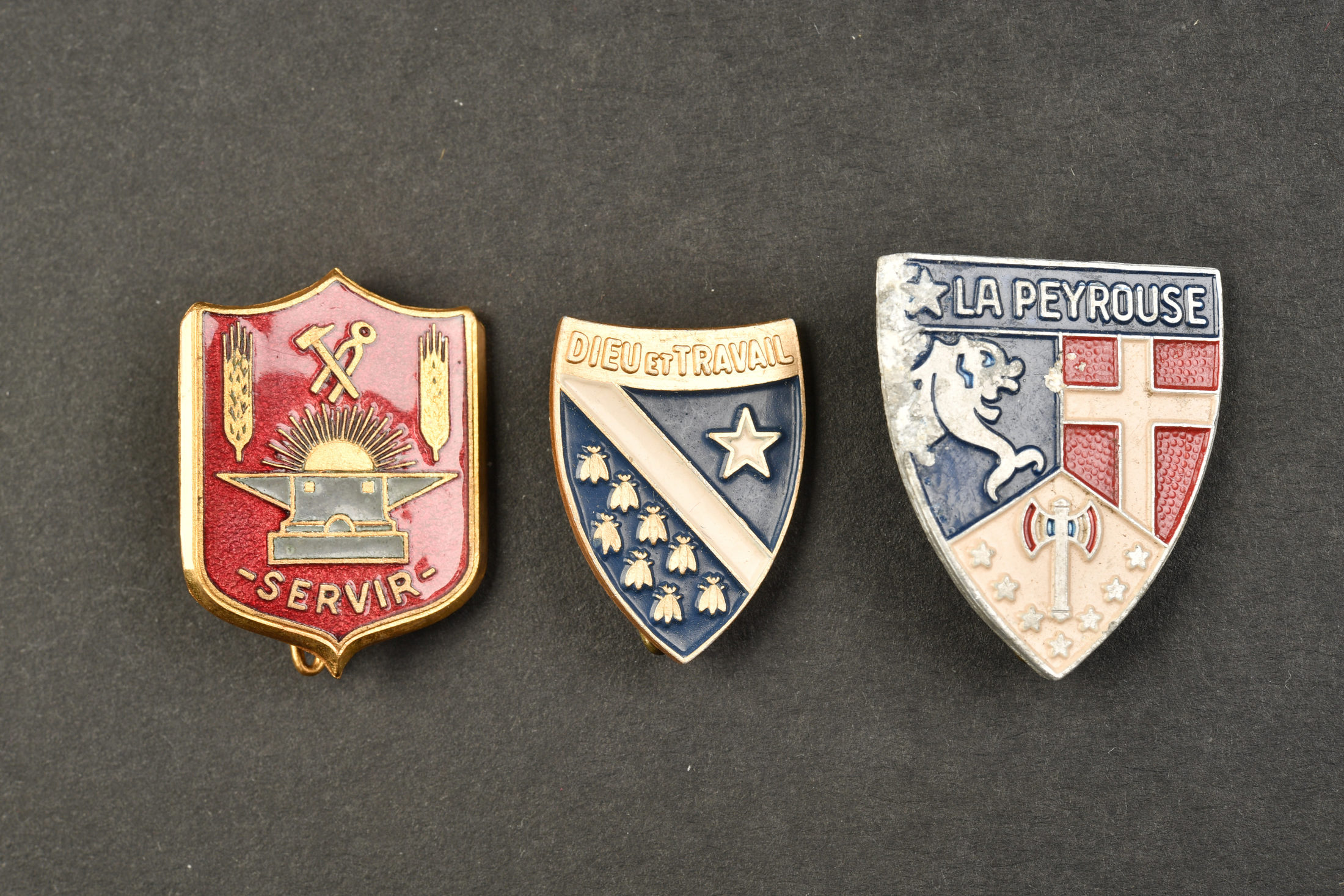 Ensemble d’insignes Vichy. Comprenant un insigne en aluminium peint des Camps de Jeunes de l’Action Française. Un insigne du Centre de Jeunesse de l’Ecole des Cadres de Savoie dit La Peyrouse, insigne légèrement abimé sur la tranche fabrication sur la tranche Paquet. Un insigne du Centre de Jeunesse portant la mention Servir, fabrication en métal émaillé Drago Paris Nice.