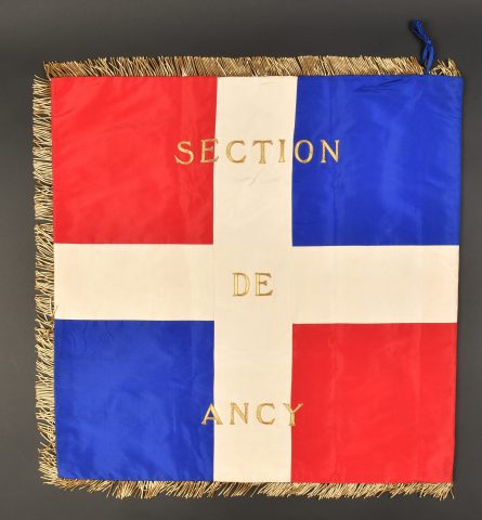 Fanion de la Légion Française des Combattants. Fanion tricolore biface brodé au fil d’or Légion Française des Combattants ainsi que l’insigne de l’organisation au centre. Sur l’autre face est brodée Section de Ancy également au fil d’or. Dimensions 69x69cm.