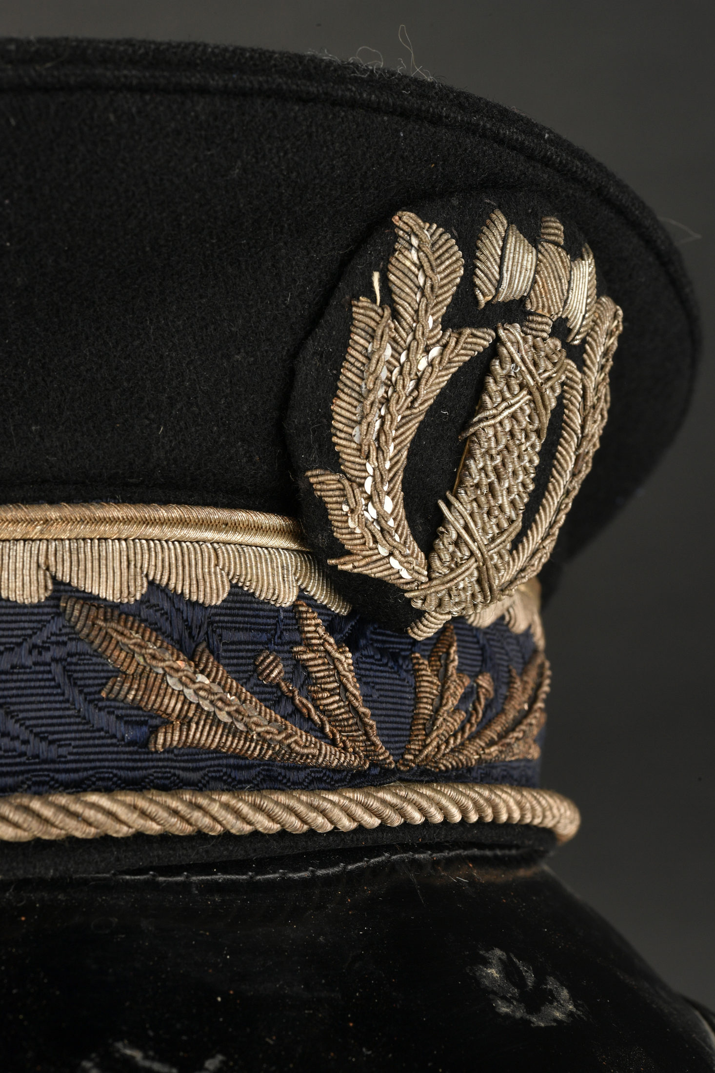 Casquette de commandant des gardiens de la paix, confectionnée en drap bleu marine, bandeau noir brodé de feuilles d’acanthes, bordé dans sa partie supérieur d’une baguette en paillettes et filet en cannetille or. A l’avant se trouve deux feuilles d’acanthes brodées en cannetille identifiant le grade de commandant. 1ttribut frontal en drap noir orné d’une francisque en cannetille entourée de feuilles d’acanthes. Jugulaire tressée dorée retenue par deux boutons portant la francisque. Doublure en satinette noire, bandeau en cuir noir, visière en fibre vulcanisée présentant une petite fissure.
