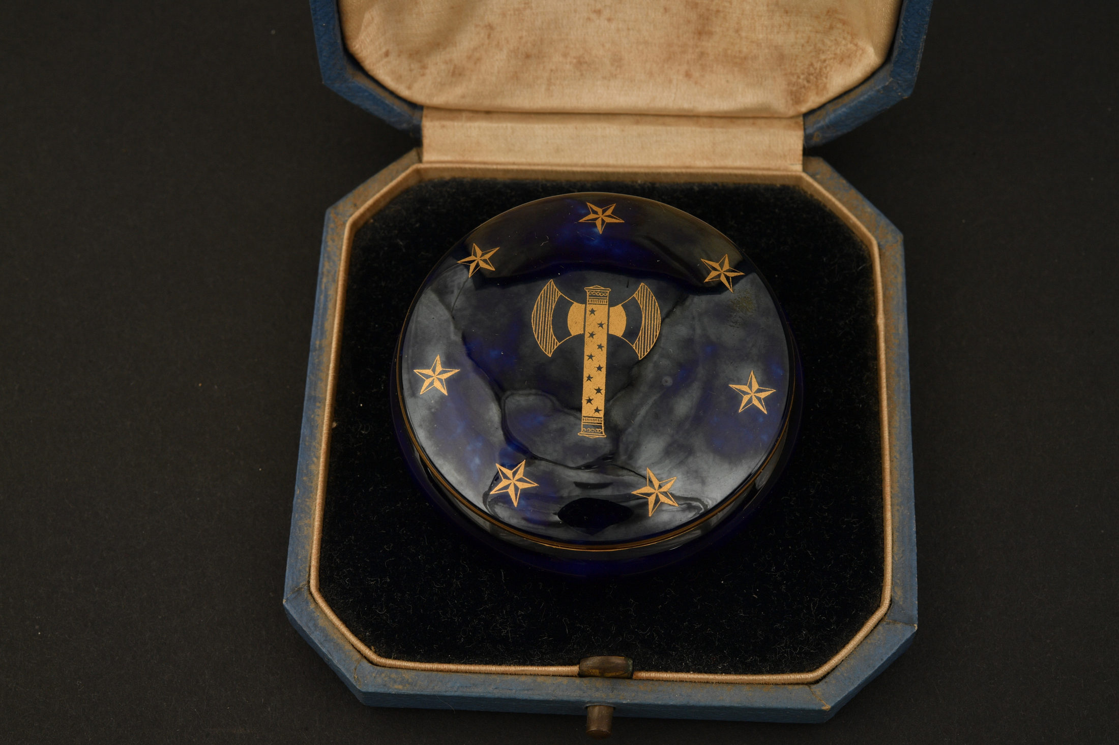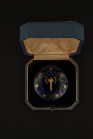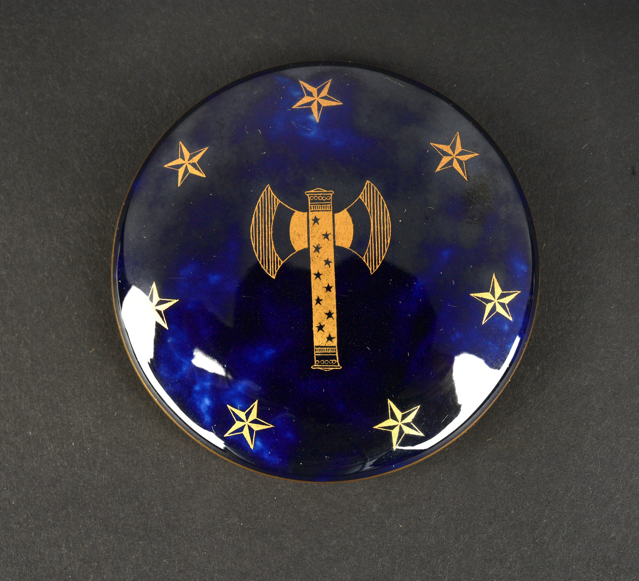 Poudrier faïence de Sèvres. Petit boite en faïence de Sèvres, sur le couvercle se trouve une francisque entourée de 7 étoiles dorées, l’intérieur du couvercle porte la mention Offert... en savoir plus