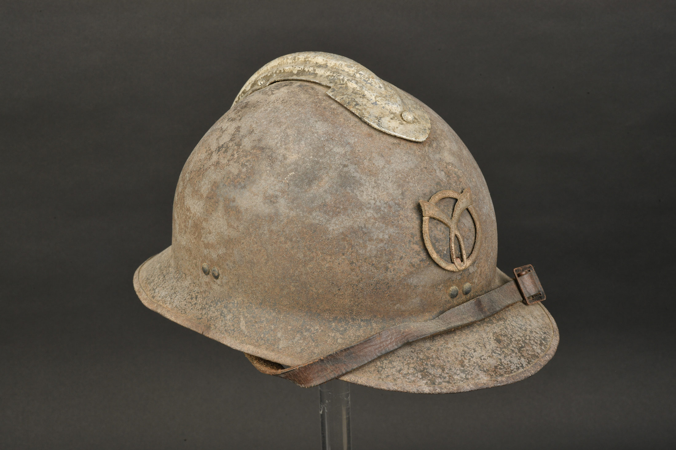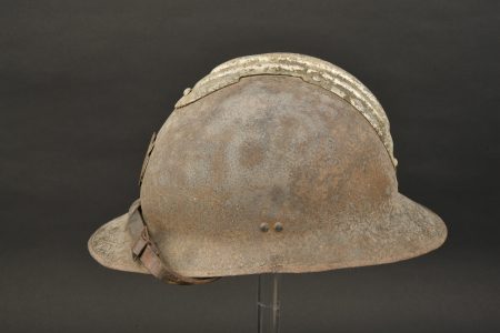 Casque Adrian 1926 Milice. Casque Adrian modèle 1926, cimier en aluminium, peinture kaki à moins de 50%. Attribut frontal de la Milice en métal léger embouti, Largeur 4,5cm. Bon modèle avec... en savoir plus