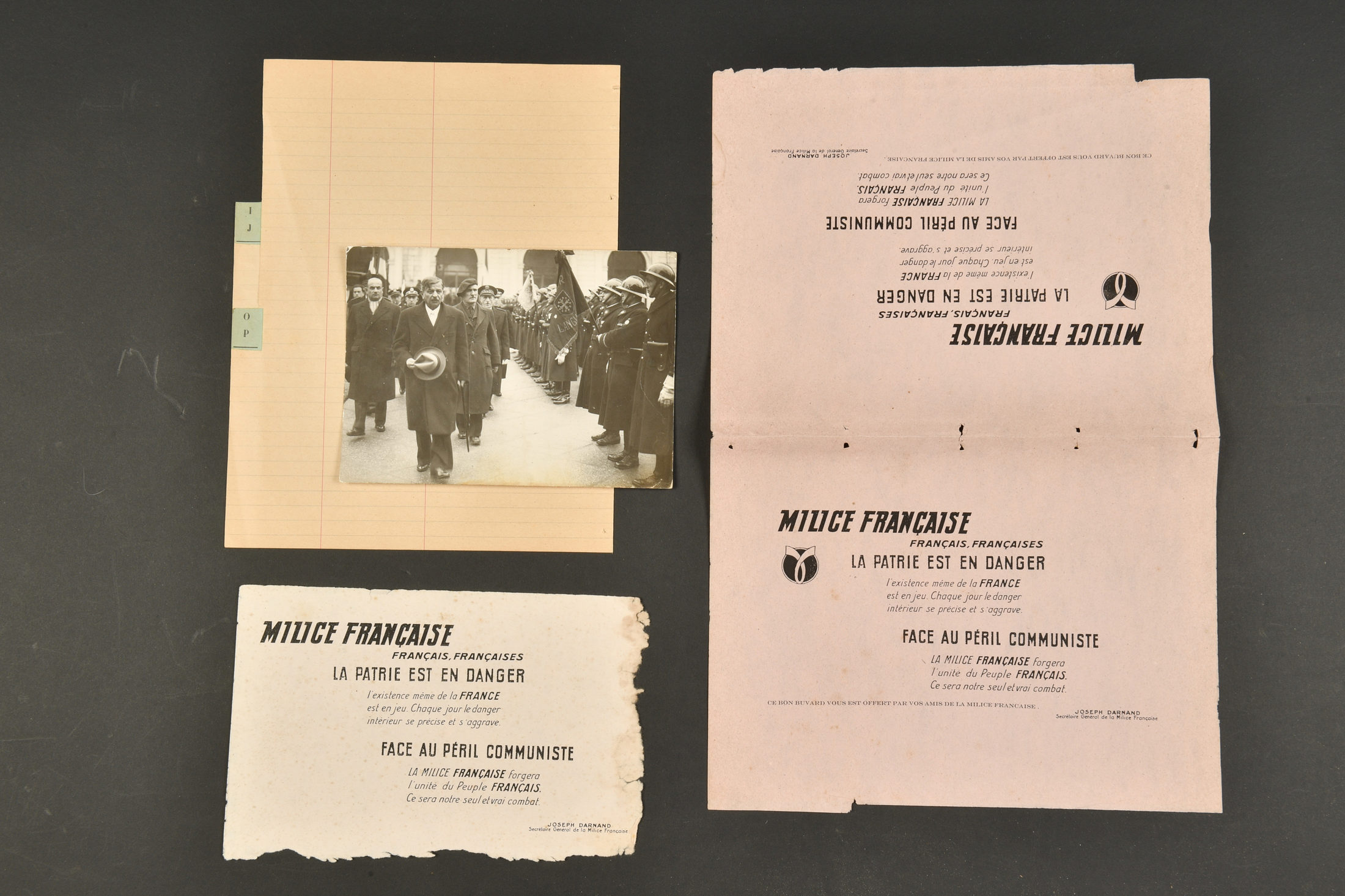 Ensemble de documents Milice. Comprenant un buvard petit format ainsi qu’un buvard dépliant. Une photo de presse de Laval et Darnand passant en revue les GMR du Languedoc.