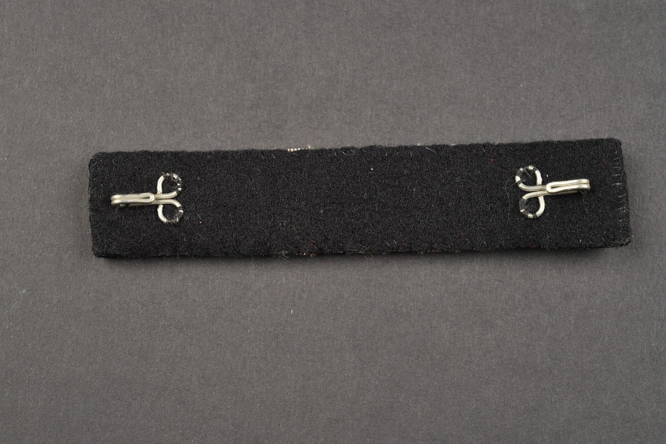 Grade du Service d’Ordre du Légionnaire. Barrette de grade de Chef de Cohorte Adjoint confectionnée en drap noir, trois galons argentés rapportés. Deux agrafes de maintien au dos.