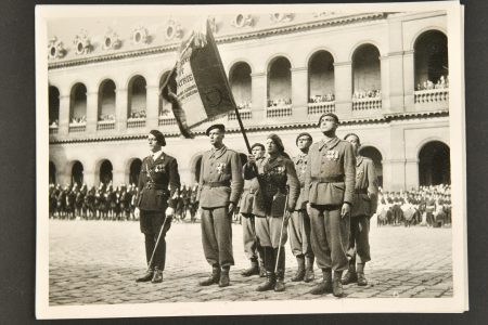Ensemble de photos de presse LVF. Comprenant 3 photos de presse de la LVF, Format 18x13cm. Deuxième anniversaire de la Légion cérémonie aux Invalides en aout 43, drapeaux et garde... en savoir plus