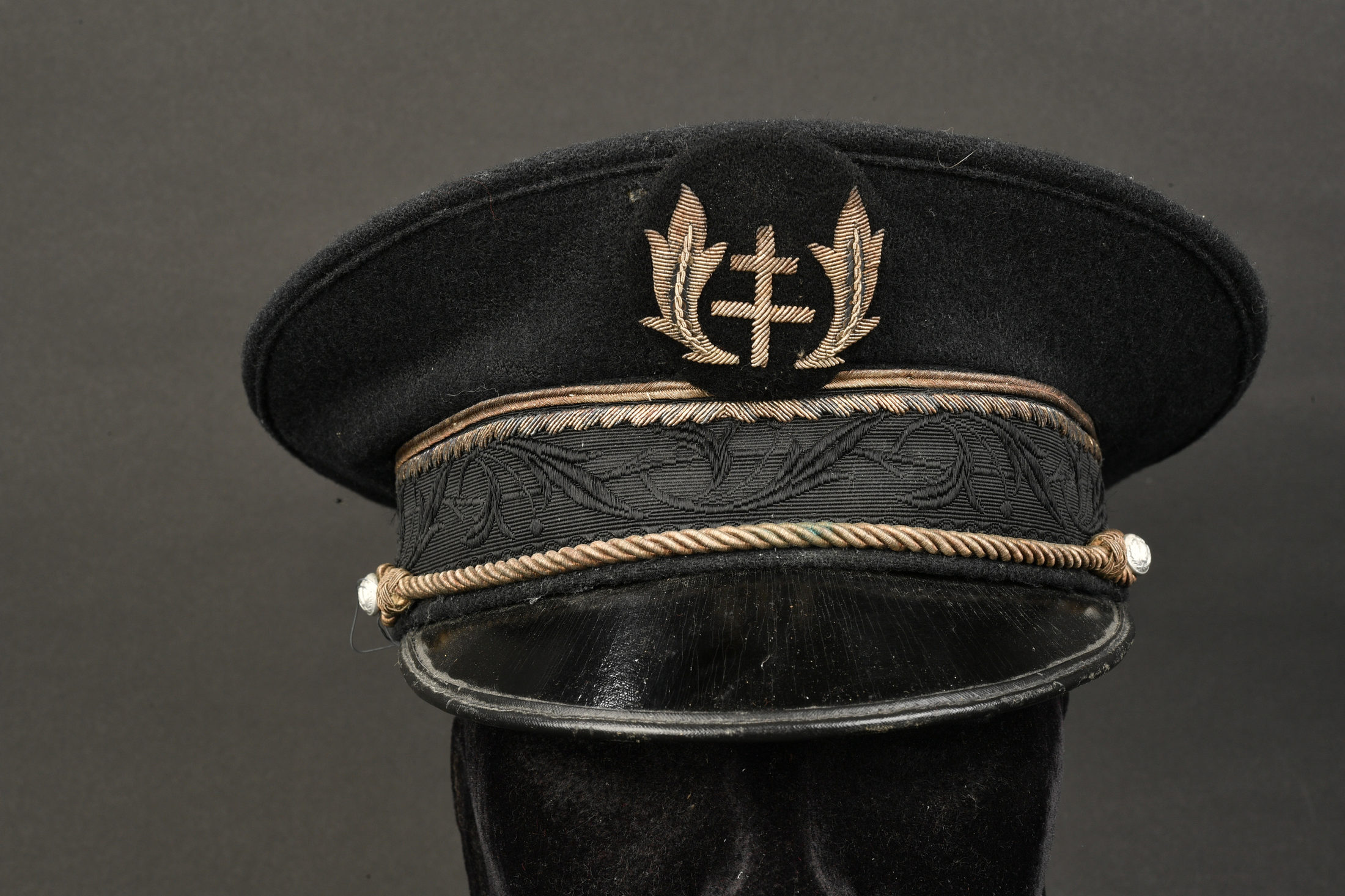 Casquette officier de police Libération. Casquette d’officier de police époque Libération réalisée à partir d’une casquette de police sous Vichy confectionnée dont l’attribut a été changé. Confection en laine bleu marine, bandeau noir orné de feuilles d’acanthes bordé dans sa partie supérieur d’une baguette en paillettes et filet en cannetille or. Attribut frontal représentant une croix de Lorraine brodée cannetille entourée de deux feuilles d’acanthes, jugulaire tressée dorée maintenue par deux boutons à francisque, visière en cuir. Doublure en satinette noire, bandeau en cuir noir.