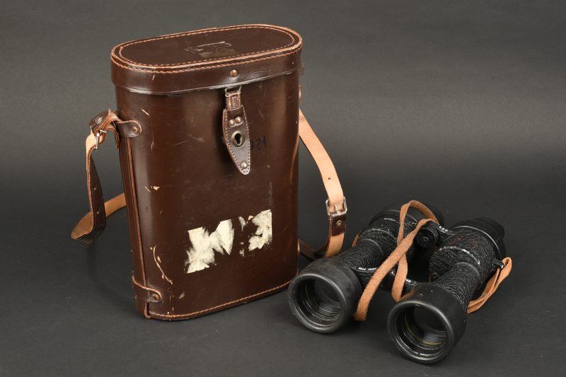 Paire de jumelles 7×50. Jumelles 7×50 modèle 1955, numéro 249 Huet. Etui de transport en cuir non du modèle.