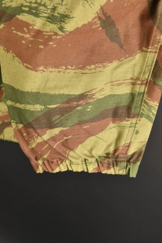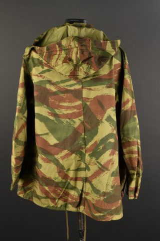 Veste TAP 47/56 modèle Spécimen type. Veste entièrement fabriquée en tissu camouflé 47/56 précoce, pressions fonctionnelles possédant encore leur peinture d’origine. Fermeture éclaire de marque Spidex, œillets d’aération aux poches. Etiquette de taille 36 au col, capuche d’origine. Accrochée d’origine à la veste, une étiquette de l’inspection technique de l’habillement décrivant un spécimen type de veste de saut en tissu camouflé pour parachutiste le 19 juillet 1956. Veste à l’état neuf.