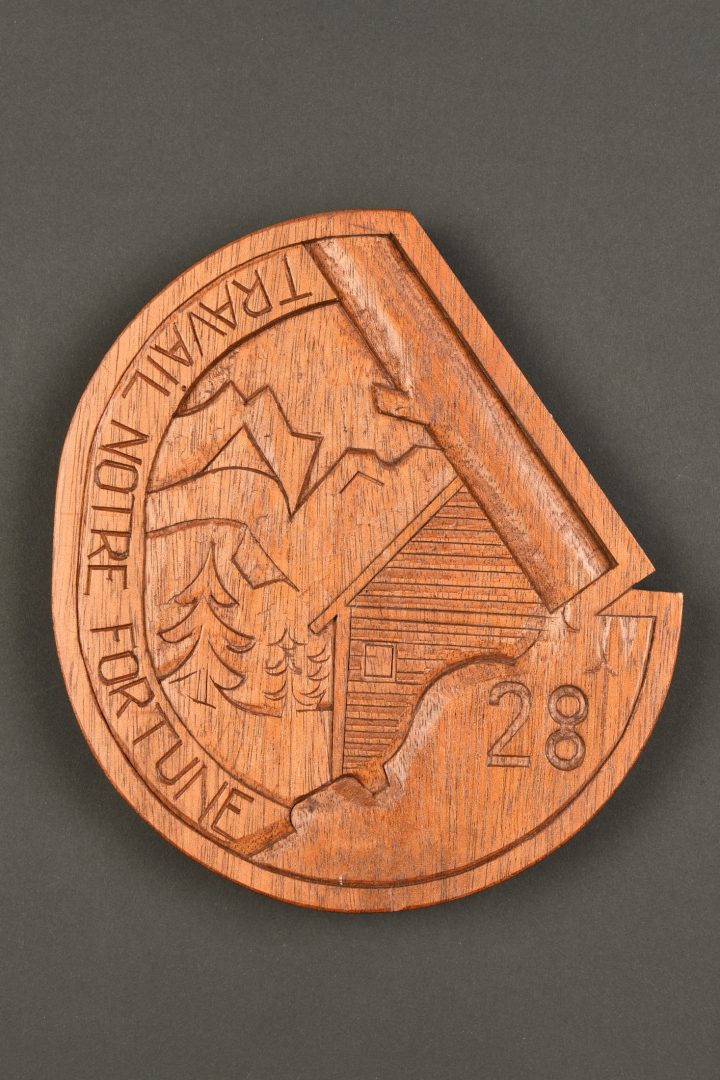 Travail de Jeune du Groupement 28. Travail en bois réalisé par un jeune du Groupement 28 et représentant l’insigne du Groupement 28. Diamètre 19cm. Provenance collection Christian... en savoir plus
