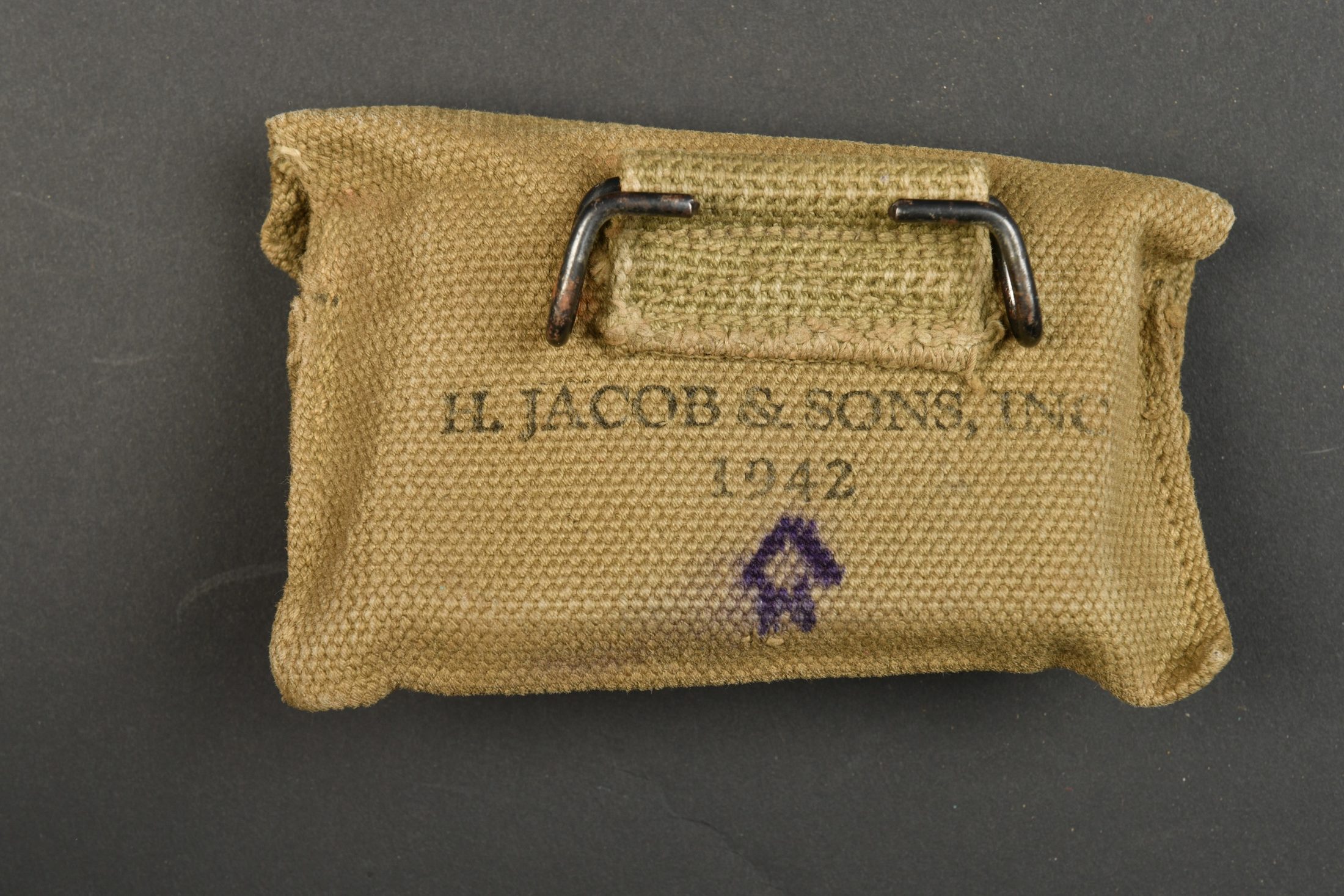 Ensemble d’équipement US. Comprenant une pochette pour chargeurs de Colt 45, les boutons pressions sont fonctionnels, marquages illisibles sous le rabat. Une pochette pour pansement en... en savoir plus