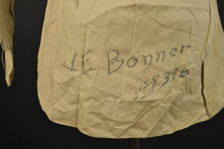 Blouson Ike de la 75ème DI. En drap kaki, tous les boutons sont présents. Grade de manche de Sergent. Insigne de la 75ème DI monté main au niveau de la manche gauche. Insigne de l’European Headquarters monté machine, ainsi que le titel ADSEC. Insigne représentant une feuille de laurier au bas de la manche droite. Barrette de 3 ans de service. Stripes de 30 mois de service outre-mer. Insigne de démobilisation monté machine. Tous les boutons sont présents. Taille 36S. Etiquette du tailleur Winshire Clothes, datée du 13 juin 1944. Doublure en tissu coton beige, indication nominative Bryson 14074334 HDSCO. On y joint une chemise en tissu chino, la majorité des boutons sont présents. Etiquette du tailleur Creighton. Indication nominative au dos de la chemise JE Bonner 134396. Nombreuses tâches et marques d’usures. A noter une certaine usure et patine des pièces. Etat II+. Lors de l’offensive des Ardennes de Von Rundstedt, la 75e se retrouve alors en première ligne, et effectue des combats défensifs à partir du 22 décembre sur l’Ourthe puis sur l’Aisne avant de reprendre le 5 janvier 1945 Grandmenil aux troupes allemandes. Le 8 janvier, la division appuie la 82e division aéroportée lors de l’attaque le long de la Salm où elle se positionne défensivement jusqu’au 17 janvier où elle reprend Vielsalm et les villes alentour. Passée à la 7e armée américaine, la 75e DIUS combat en Alsace, traverse le 1er février le canal de Colmar, prenant une part importante à la libération de la ville. Elle combat ensuite dans la plaine d’Alsace, puis ayant traversé le canal de la Marne au Rhin elle atteint le Rhin le 7 février 1945. Après un bref repos à Lunéville, il retourne au combat, le 21 février 1945, et appuie la 6e division aéroportée britannique en tenant un secteur le long de la Meuse, près de Roermond, aux Pays-Bas. Du 13 au 23 mars, le 75 patrouille le long de la rive ouest du Rhin de Wesel à Hombourg, et sonde les défenses ennemies. Le 24 mars, l’opération Varsity permet à la 75e DI de franchir le Rhin à la suite de la 30e et 79e divisions puis nettoie les abords jusqu’au 1er avril. Le 4 avril, l’unité franchit le canal Dortmund-Ems et dégage les abords de Dortmund qui est prise le 13 avril par la 95e DIUS. Après avoir pris Herdecke, le 13 avril, la division est mise au repos à Brambauer.