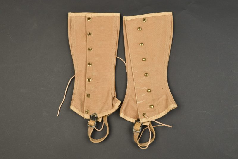 Guêtres USMC. En forte toile OD. Crochets en laiton. Les lacets sont présents. Paire homogène. Etiquette marquée US Marine Corps, taille 4. Marquages de couleur rouge, DOP 1942-1943. A noter... en savoir plus