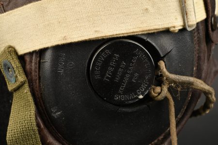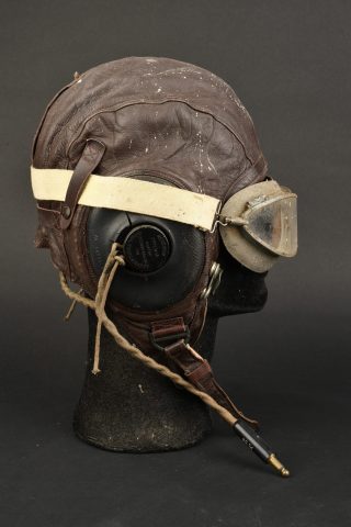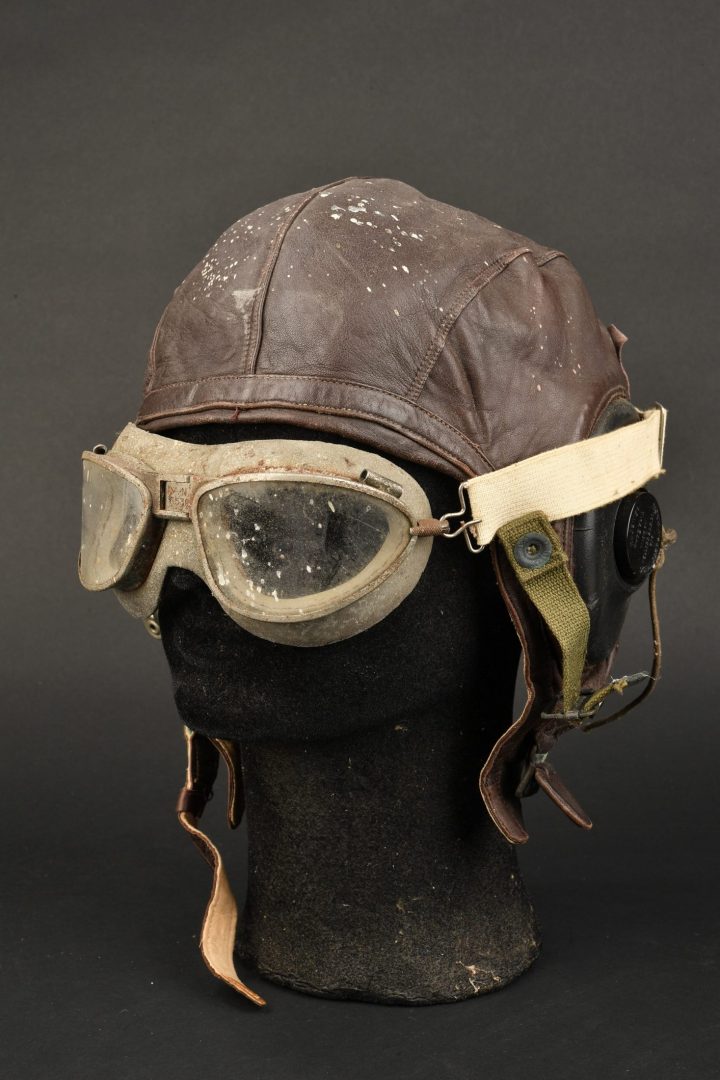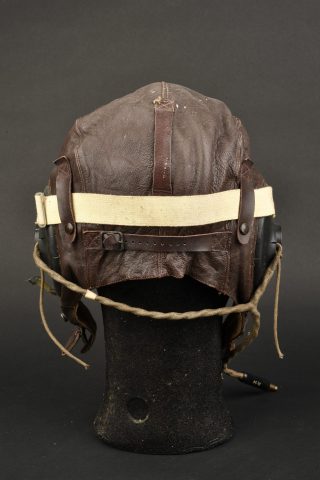 Bonnet de vol A-11. En cuir marron, doublé en peau de chamois. Jugulaire en cuir présente. Les bonnettes en caoutchouc sont partiellement craquelées. Etiquette du fabricant The Selby Shoe Co,... en savoir plus