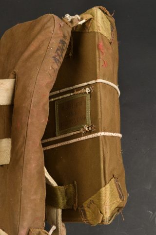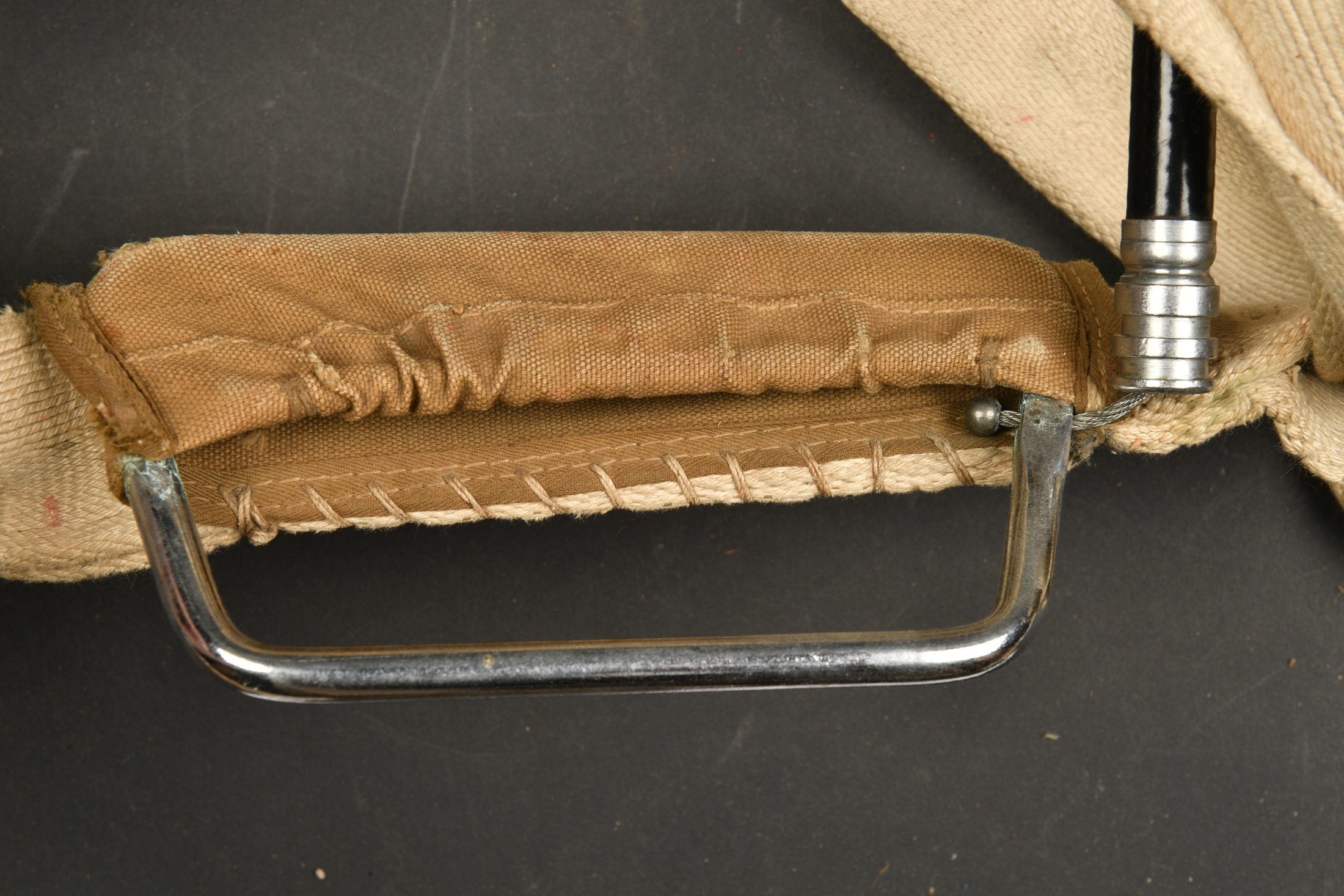 Parachute siège. Harnais en épais tissu blanc. Fermoir complet. Poignée d’ouverture complète. Coussin dorsal en toile OD, rembourrage présent, marquages illisible. Petit modèle de... en savoir plus