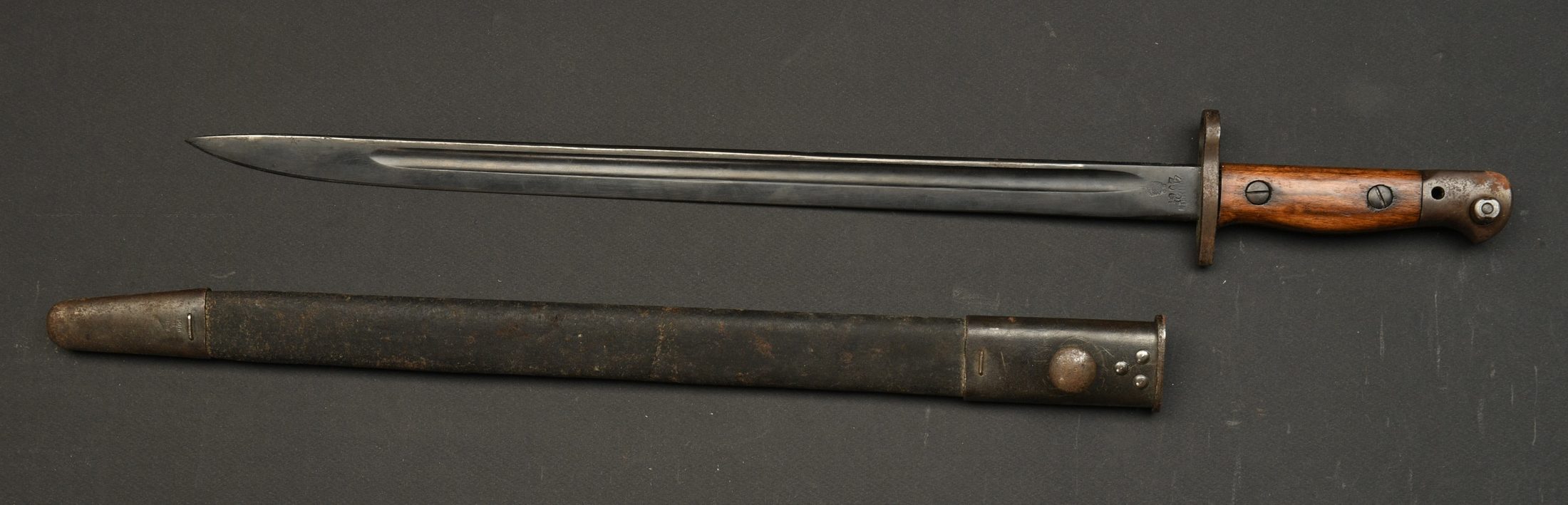 Baïonnette 1907. Poignée en bois. Les parties métalliques sont partiellement oxydées. Lame complète dans sa longueur, dans sa couleur d’origine à 90%. Fabrication 1907, marquages illisibles, flèche du War Department présente. Fourreau en métal et cuir. A noter une certaine usure et patine de la pièce. Etat II+. Plus de photos sur www.aiolfi.com. More photos on www.aiolfi.com.