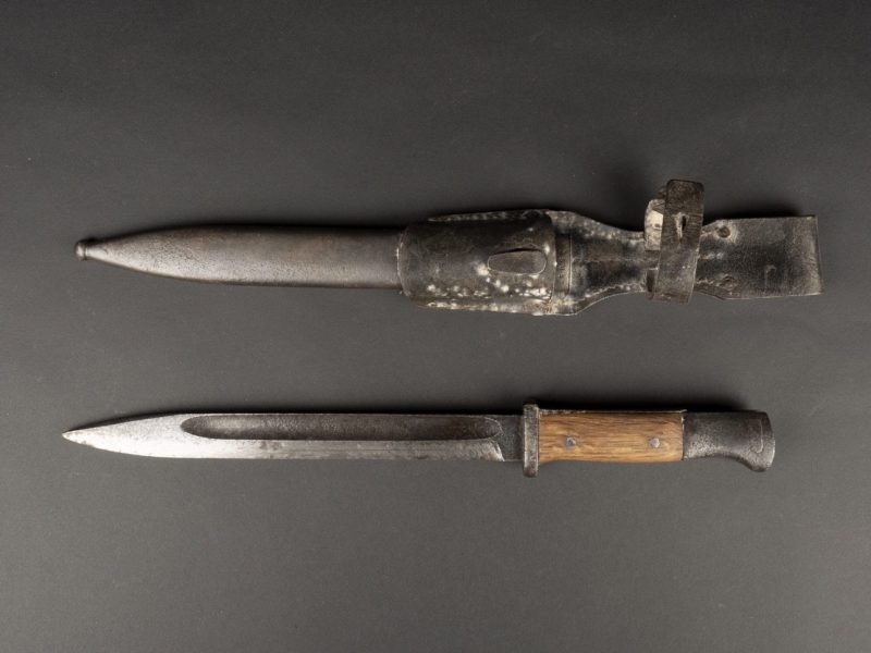 Baïonnette 98K. Plaquettes en bois. Toutes les garnitures métalliques présentent des marques d’oxydation. Lame dans sa couleur d’origine à 2%, fortement oxydée. Fabrication 41 COl, numéro 4495. Fourreau en métal, oxydé, numéro 2583. Gousset en cuir noir, marquage illisible, fortement moisi. A noter une certaine usure et patine de la pièce. Etat II+. Plus de photos sur www.aiolfi.com. More photos on www.aiolfi.com.