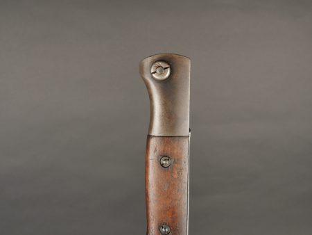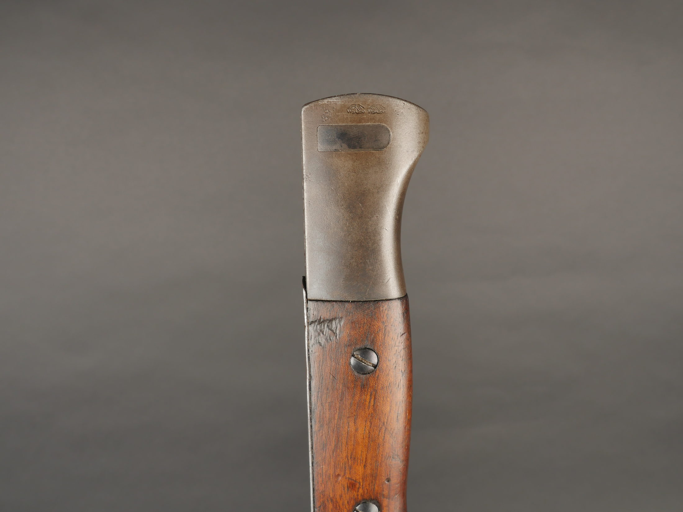 Baïonnette 98K. Plaquettes en bois. Toutes les garnitures métalliques sont oxydées. Lame dans sa couleur d’origine à 60%. Fabrication F Herder, numéro 1159h. Fourreau en métal, couleur... en savoir plus