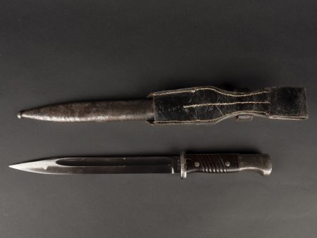 Baïonnette 98K. Plaquettes en bakélite noir. Toutes les garnitures métalliques présentent des marques d’oxydation. Lame dans sa couleur d’origine à 80%. Fabrication WKC, numéro 5157. Fourreau en métal, nombreuses traces d’oxydation et bosses, numéro 5157 WKC. Gousset en cuir noir, marquages illisibles. A noter une certaine usure et patine de la pièce. Etat II+. Plus de photos sur www.aiolfi.com. More photos on www.aiolfi.com.
