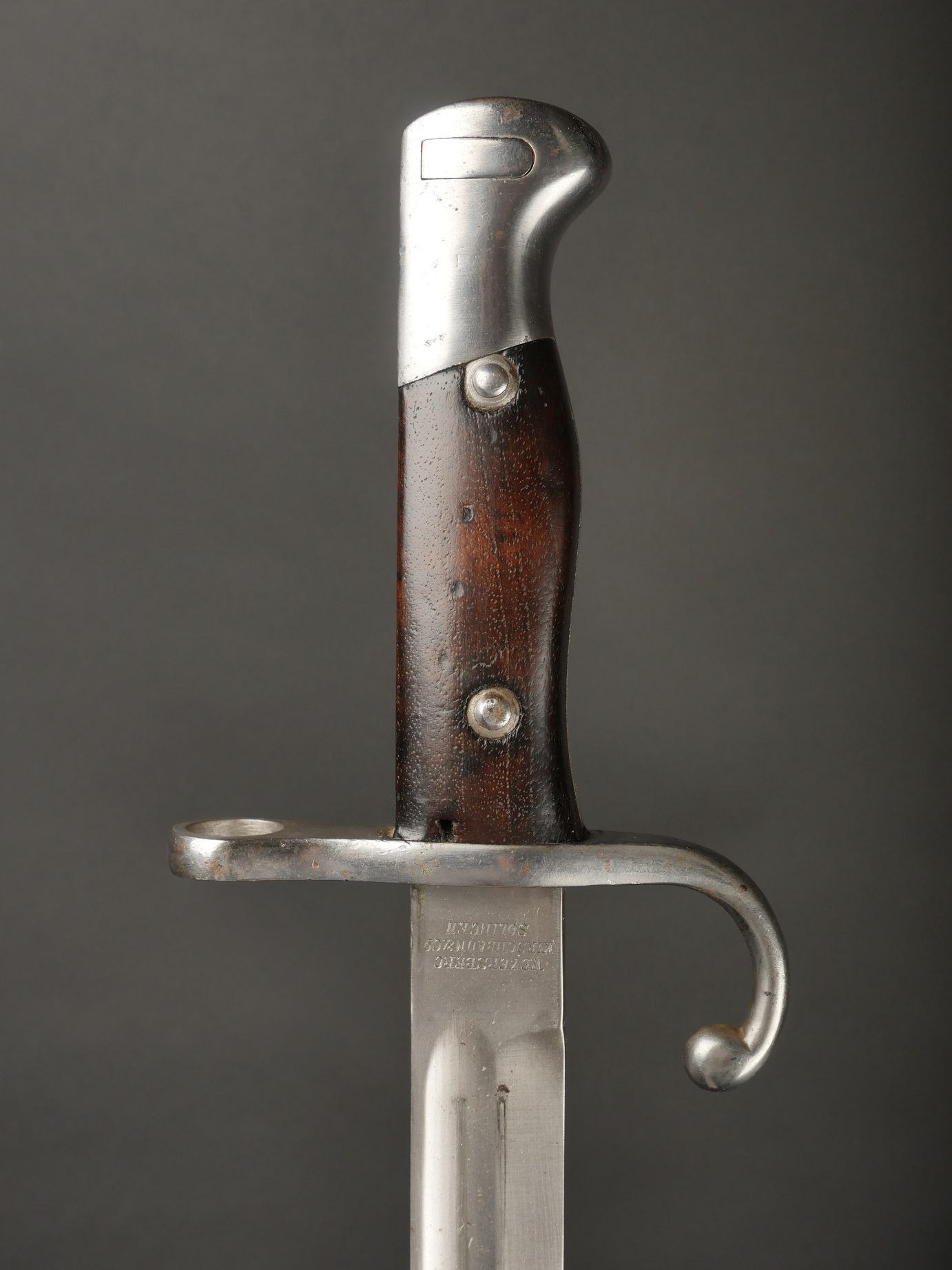 Baïonnette argentine. Garnitures en métal nickelé. Plaquette en bois maintenues par deux rivets. Belle lame complète, numéro L2976, fabrication Weyersberg Solingen. Fourreau complet, peinture... en savoir plus