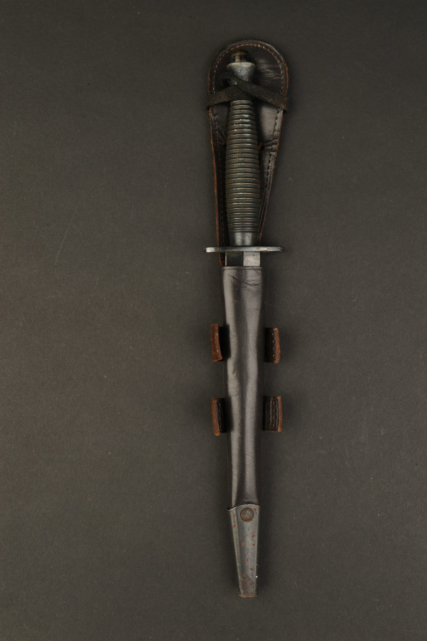 Couteau de combat Fairbairn-Sykes. Poignée annelée en métal, peinture à 60%. Belle lame dans sa couleur d’origine à 90%. Fourreau en cuir complet. Elastique distendu. A noter une... en savoir plus