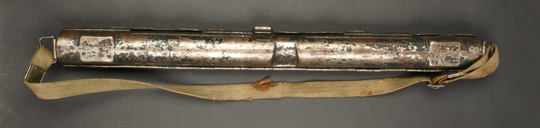 Porte canon MG 42. En métal, peinture à 40%. Le crochet de fermeture est complet. La sangle de transport est présente mais présentant des tâches et des déchirures. Fabrication BRC 43. A... en savoir plus