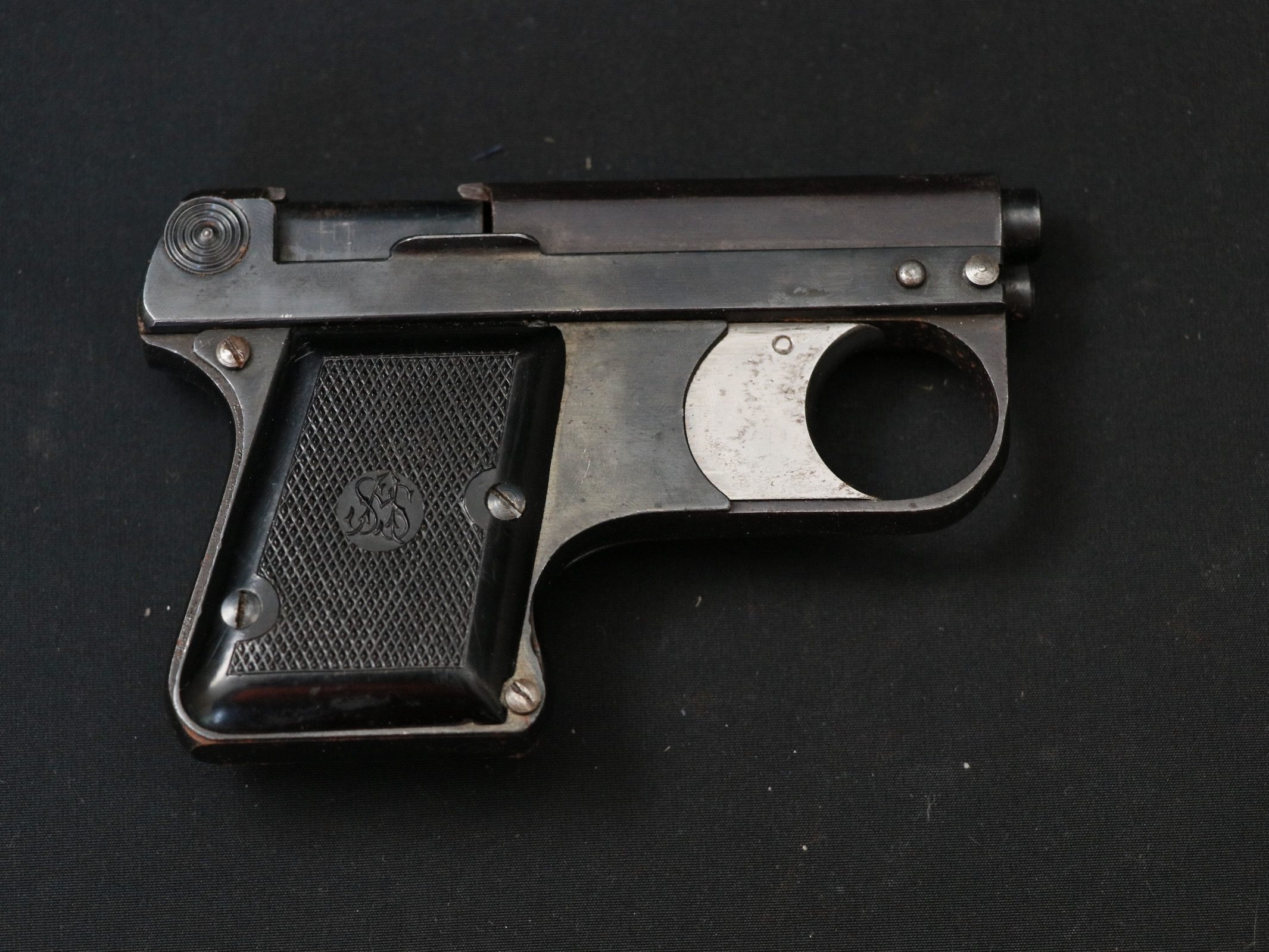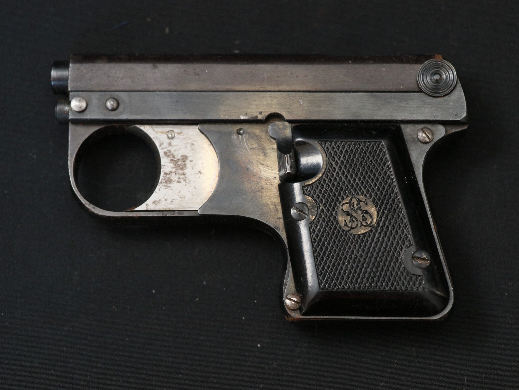 Revolver d’alarme. Allemand. Fabricant ASS (August Schüler Suhl) Modèle 33/6. Calibre 6mm Flobert à blanc. Très bon état d’origine, très rare. A noter une certaine usure et oxydation de la pièce. Etat II+. Plus de photos sur www.aiolfi.com. More photos on www.aiolfi.com.