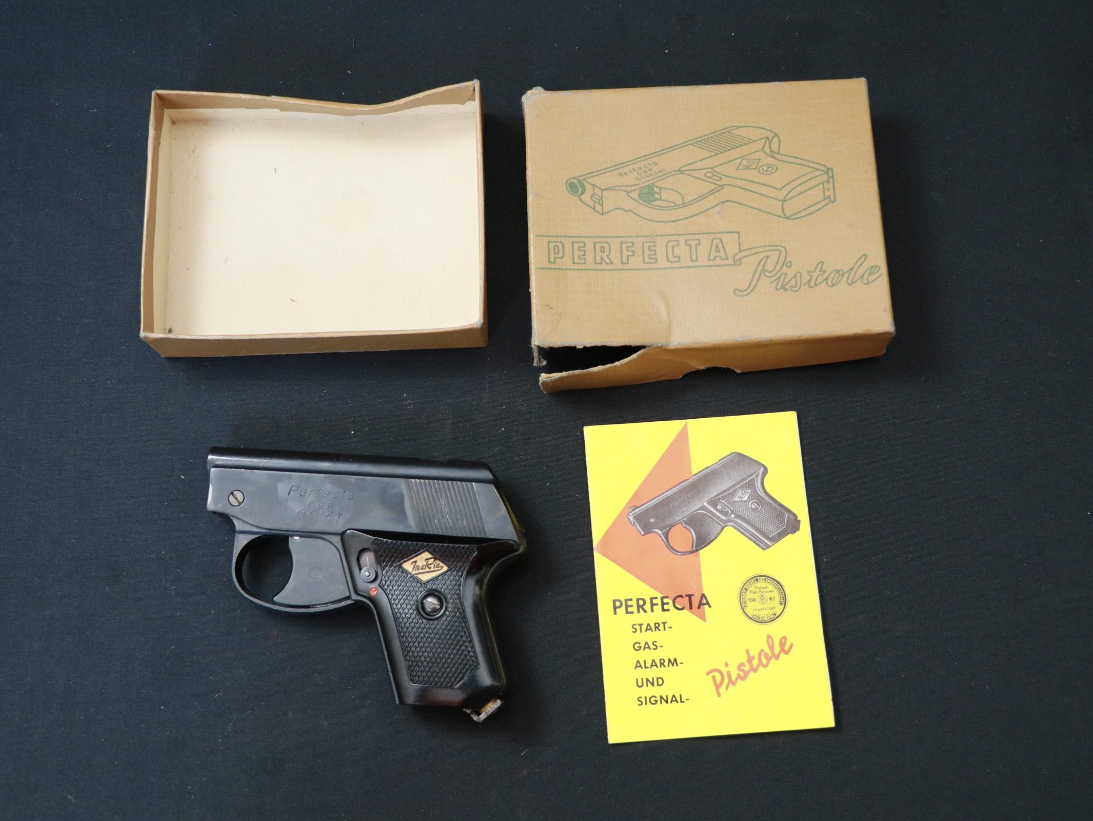 Revolver d’alarme. Allemand. Fabricant Mayer & Riem. Modèle Perfecta. Calibre 6mm Flobert à blanc. Dans la boîte d’origine. (Endommagé) Bon état d’origine, rare. A noter une certaine usure et oxydation de la pièce. Etat II+. Plus de photos sur www.aiolfi.com. More photos on www.aiolfi.com.
