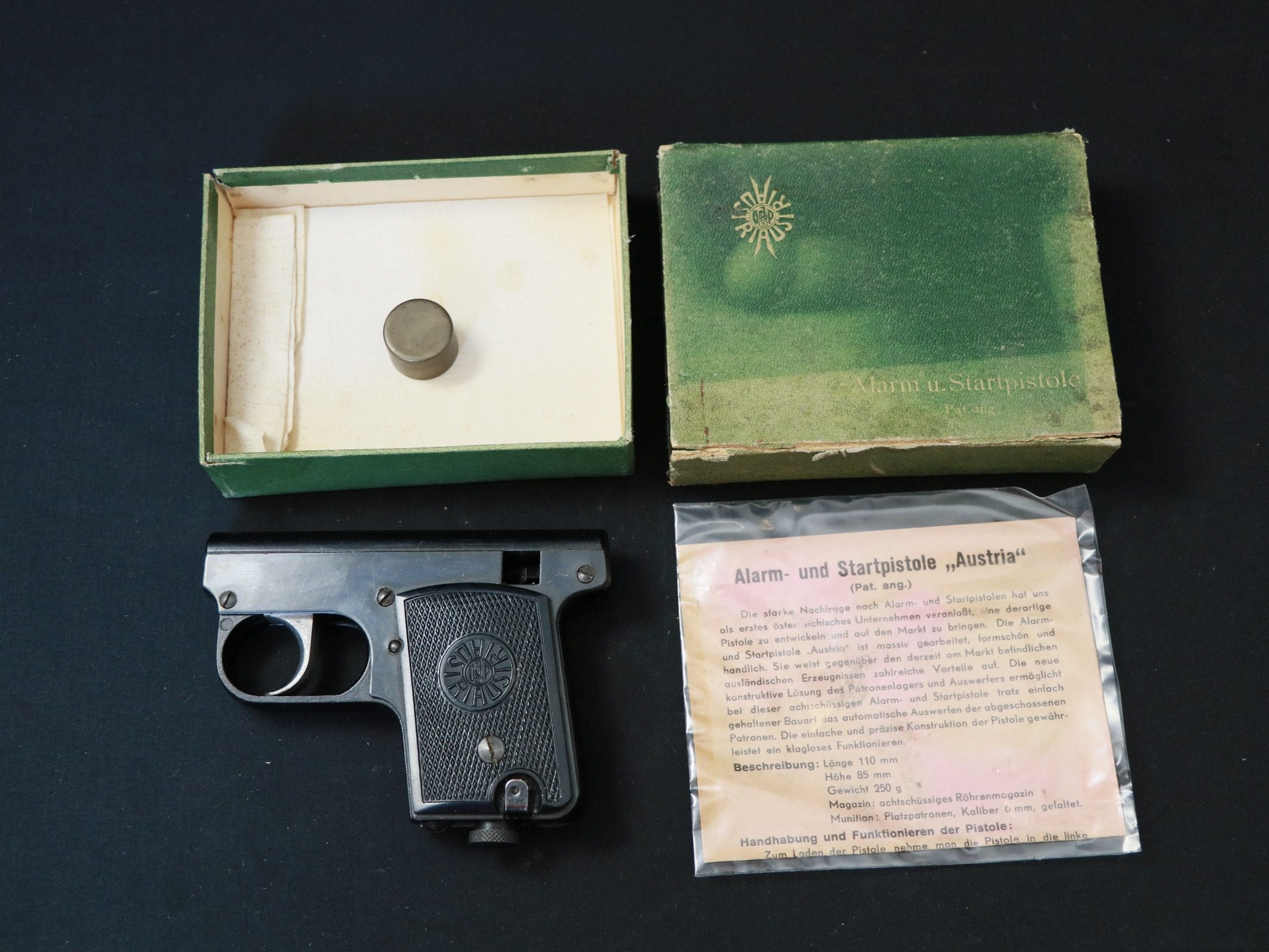 Revolver d’alarme. Autriche. Fabricant ÖJP Modèle Austria. Calibre 6mm Flobert à blanc. Dans la boîte d’origine. Très bon état d’origine (Endommagé). Tres rare. A noter une certaine usure et oxydation de la pièce. Etat II+. Plus de photos sur www.aiolfi.com. More photos on www.aiolfi.com.
