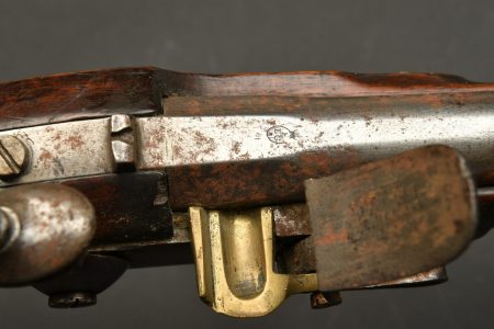 Fusil à silex 1777. Fusil à silex type 1777, garniture et plaque de couche en laiton, pas de marquage sur la platine. Poinçon liégeois sur le tonnerre et AM sur la crosse, baguette présente.... en savoir plus