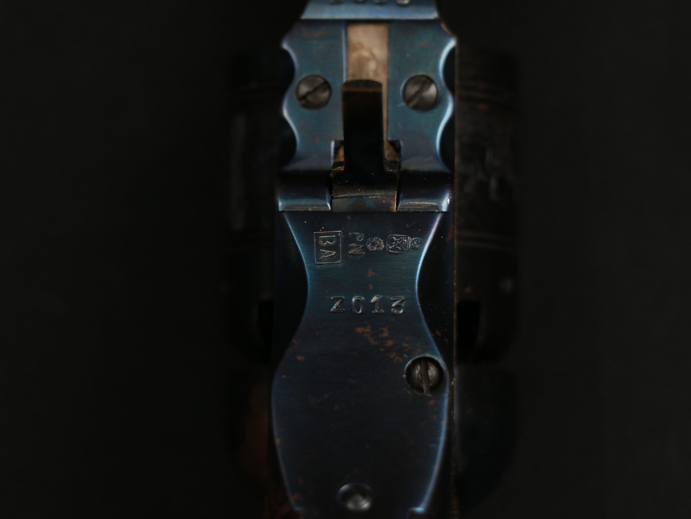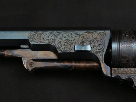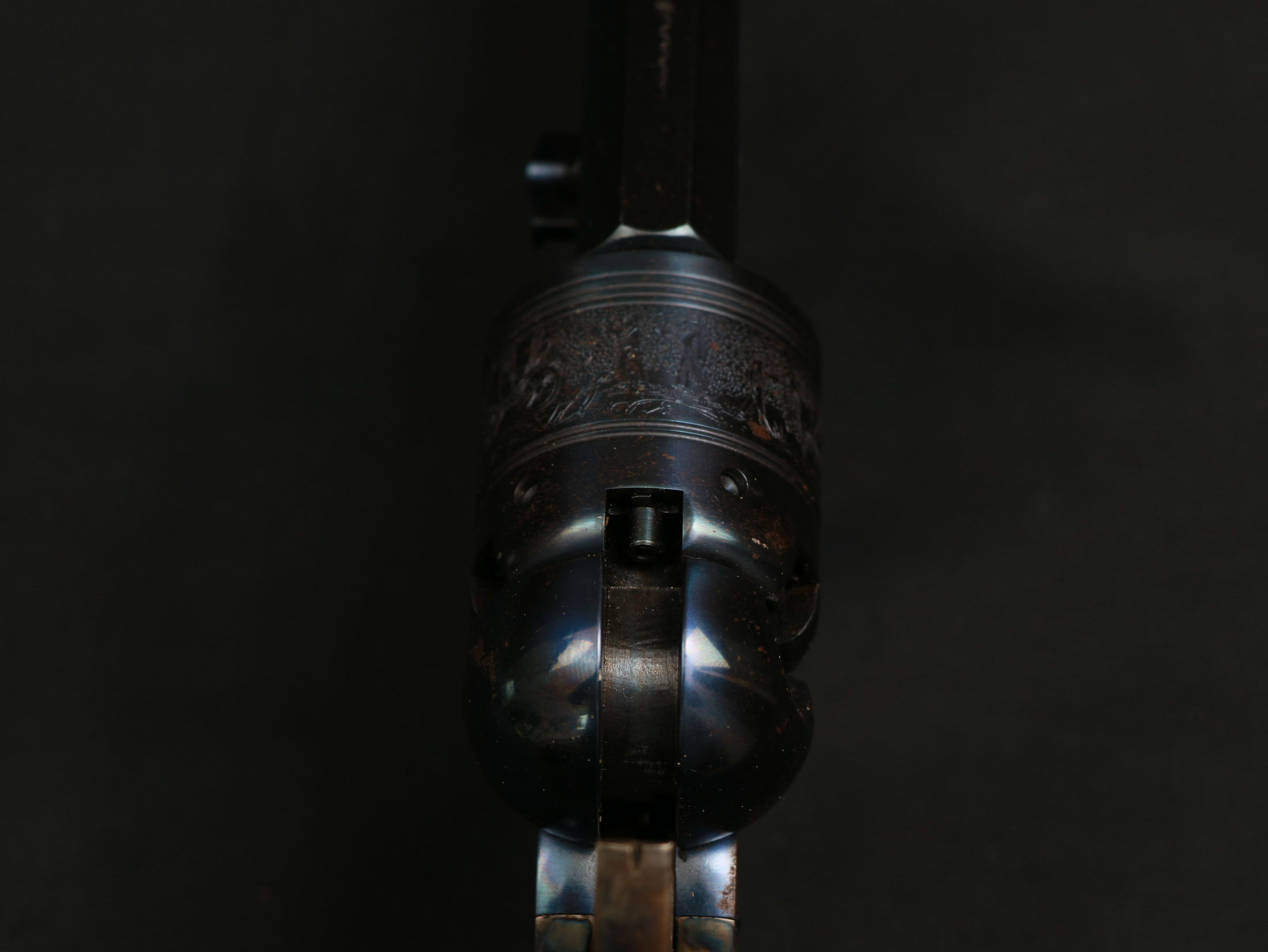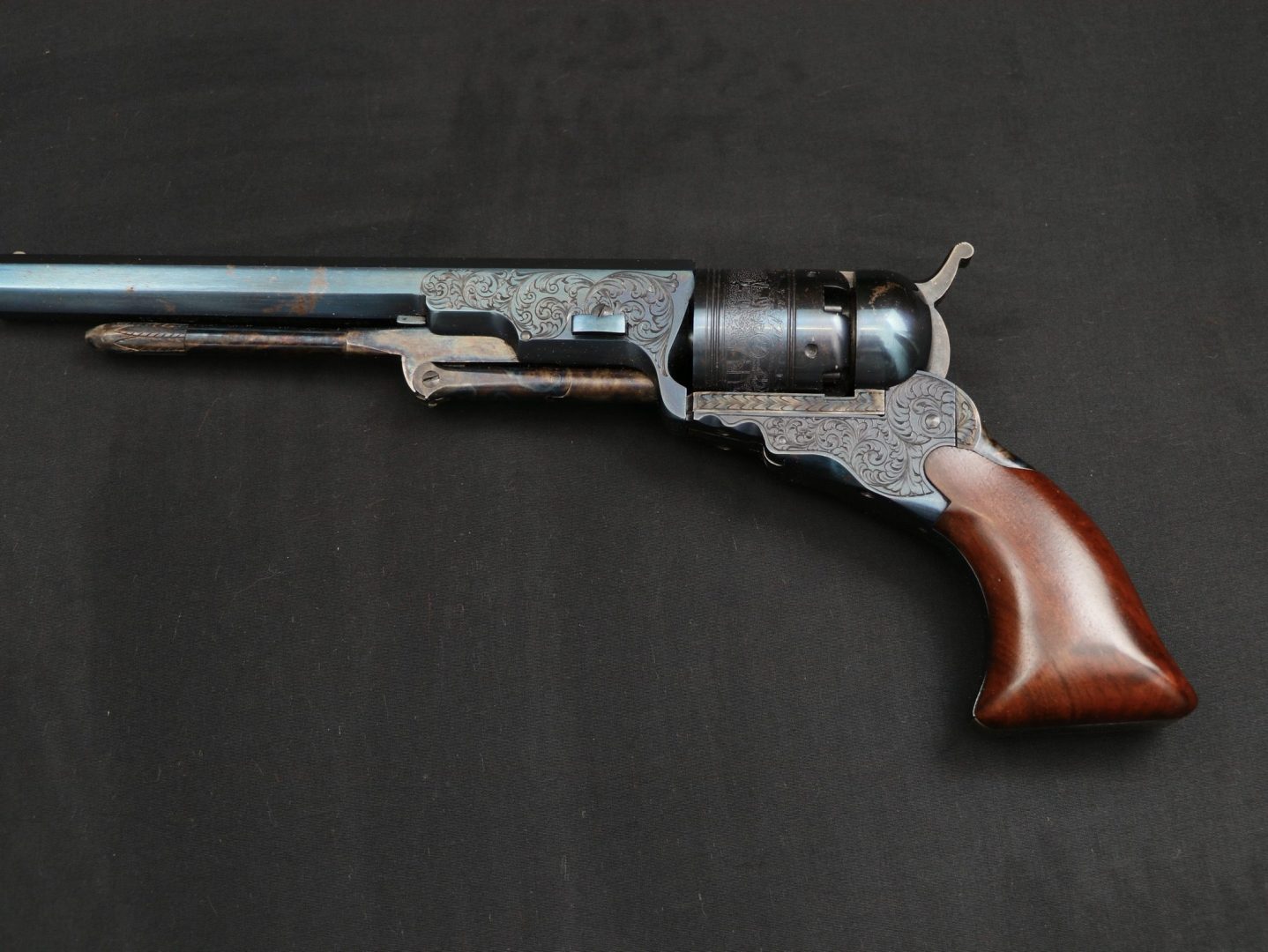 Gravé Colt Peterson réplique de haute qualité de l’Italie. Calibre. 36BP. Numéro de série Z013. Miroir clair 7 1/2 inch canon. la mécanique fonctionne. Surface légèrement tachée.... en savoir plus