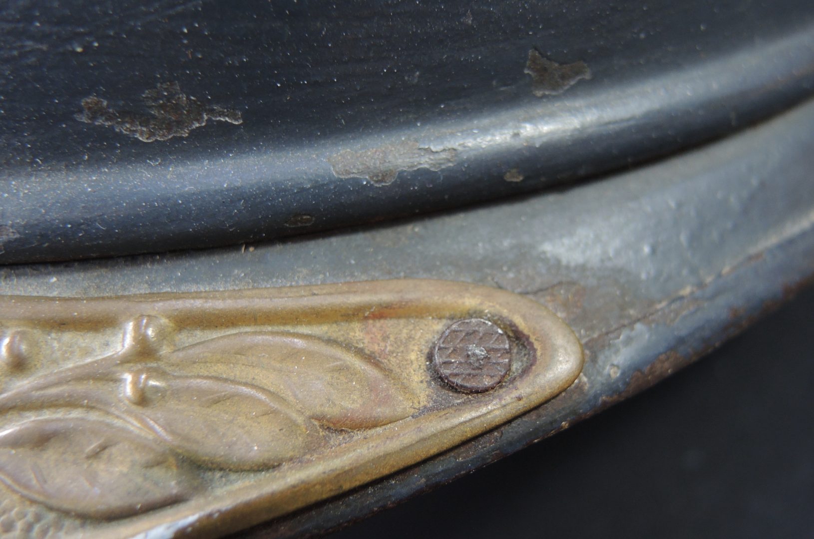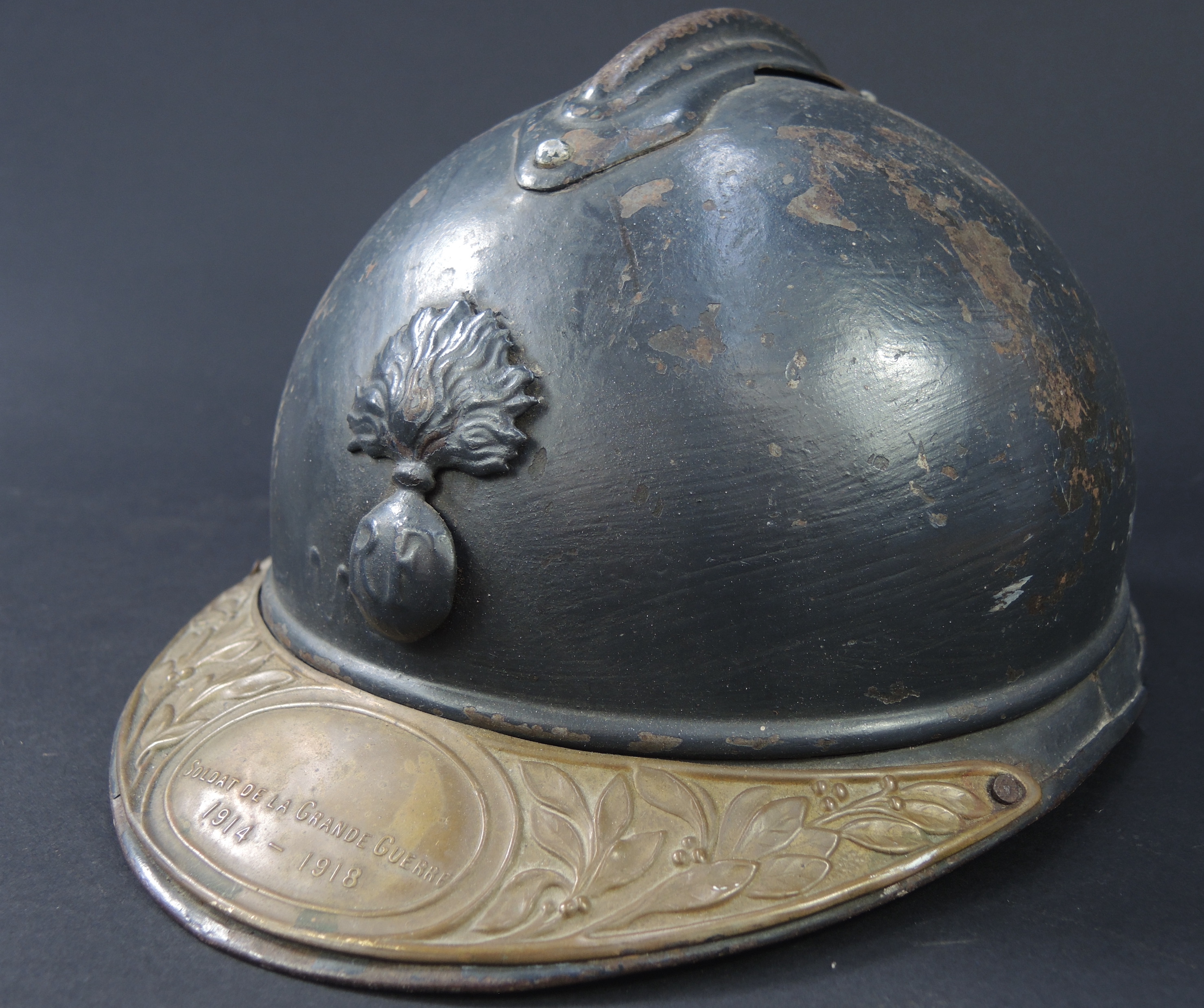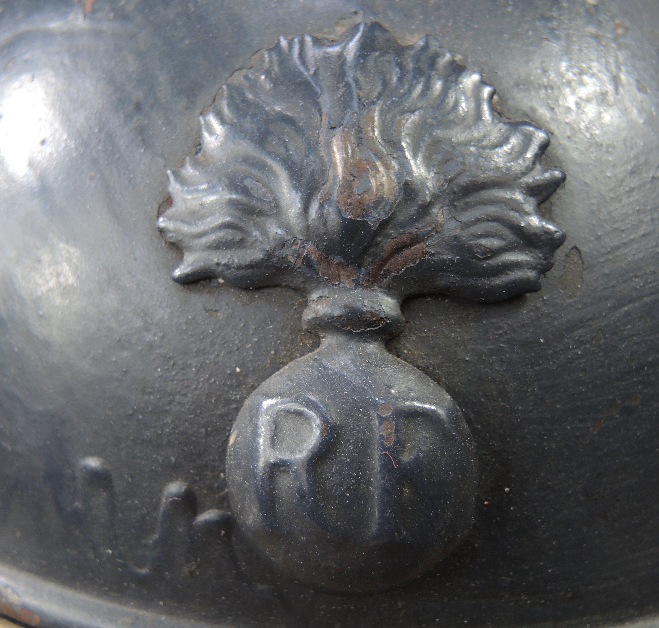 Casque Adrian 1915 infanterie. Attribut modèle 1915 de l’infanterie, peinture du second type présente à 80%, intérieur du second type en cuir fauve à six dents de loup, quatre gaufrettes en aluminium présentes. Jugulaire absente , plaque commémorative fixée d’origine.