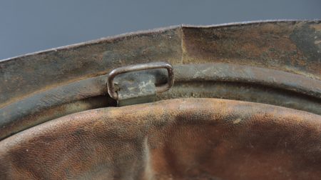 Casque Adrian 1915 infanterie. Attribut modèle 1915 de l’infanterie, peinture du second type présente à 80%, intérieur du second type en cuir fauve à six dents de loup, quatre... en savoir plus