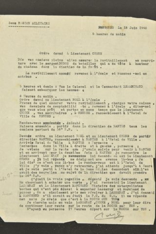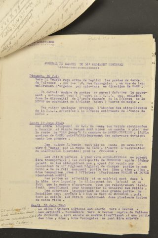 Journal de marche du 36ème régiment régional. Important lot de documents ayant appartenu au Colonel Cottard Emile, comprenant notamment son journal de marche manuscrit qu’il rédigea à partir du 16 Juin 1940 jusqu’au 25 juin , 10 pages au total . Le même journal mais tapuscrit . Un compte rendu du Commandant du 1/36 RR sur le repli de Caen à Vic Fezensac du 27 juin 1940 comprenant notamment les pertes, au total 5 pages. Un compte rendu des évènements qui se sont succédés après le repli du Régiment du 17 juin 1940 au 6 juillet 1940 , au total 12 pages. Divers compte rendu du 36 RR durant la période de Juin de 1940. Certificat de démobilisation du Colonel Cottard.