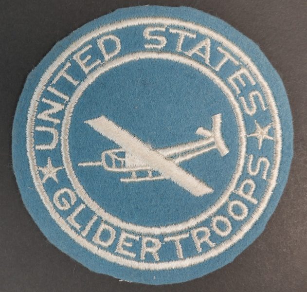 Patch de poitrine Glider Troops. Modèle brodé sur fond bleu ciel. Marquages United States Glidertroops. A noter une certaine usure et patine de la pièce. Etat II+.