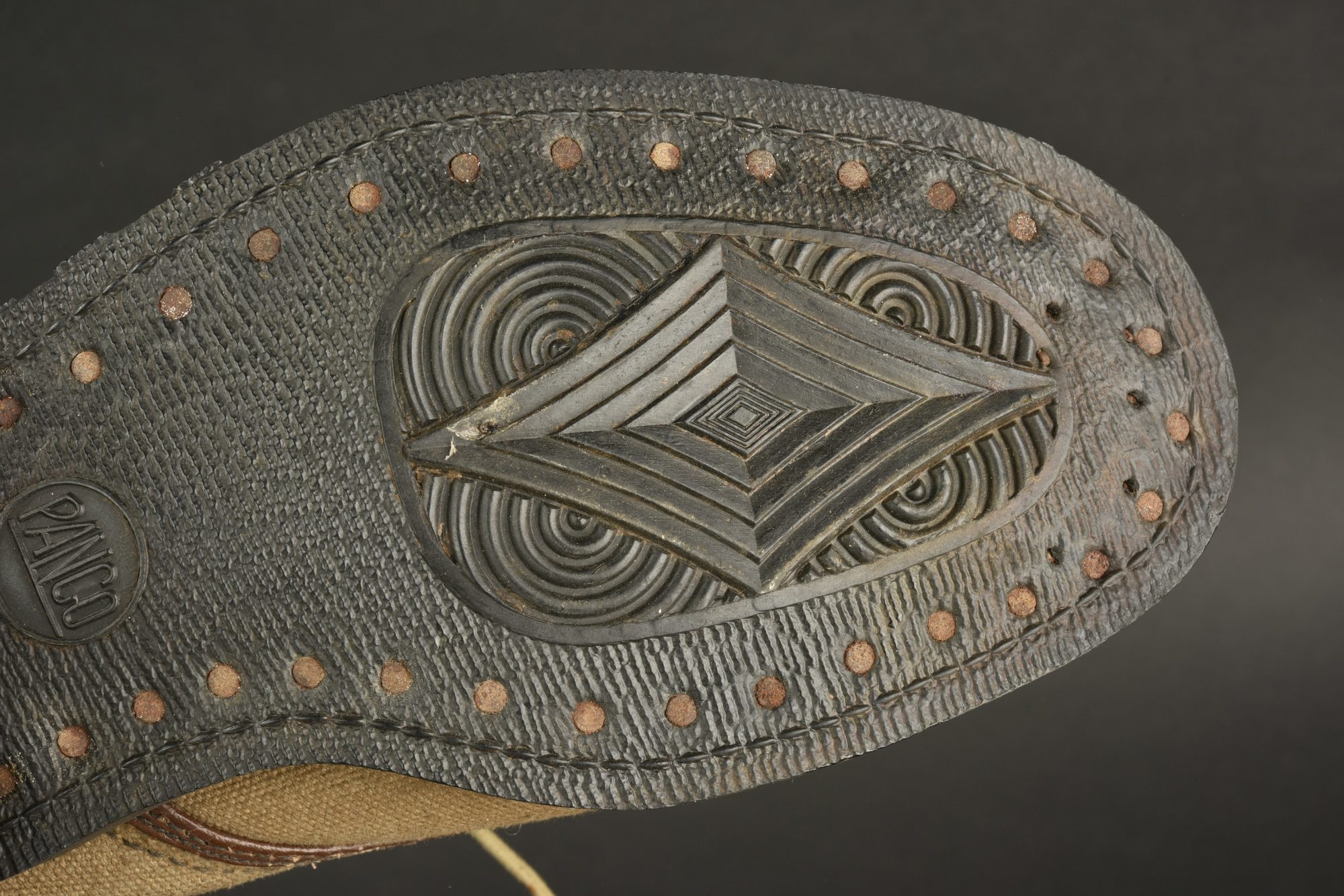 Brodequins de casernement US. En forte toile beige et cuir marron. Sept œillets de laçage. Les lacets sont présents. Paire homogène. Les semelles en caoutchouc sont marquées Panco. Elles sont... en savoir plus