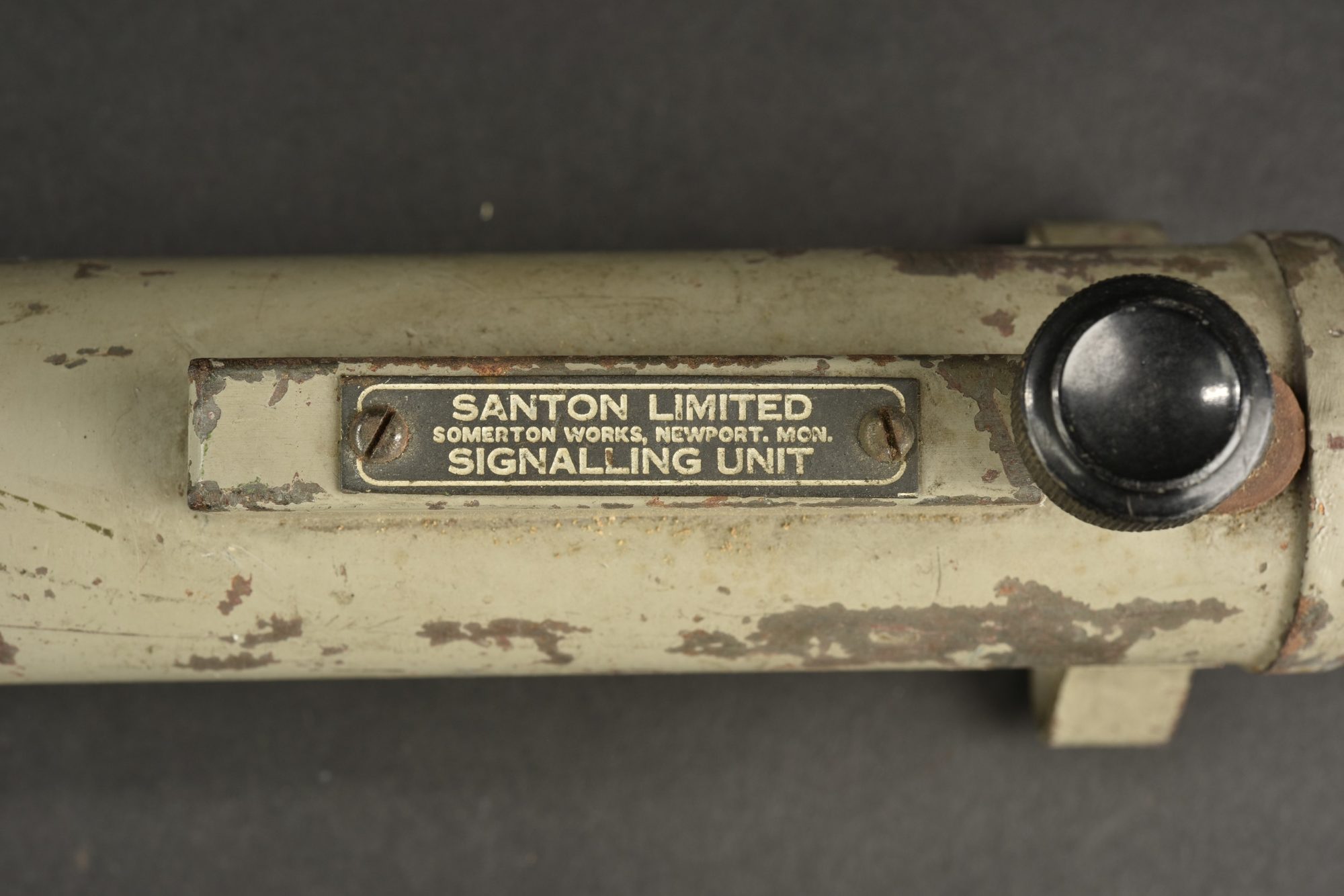 Accessoire de survie US Navy. Comprenant une lampe de signalisation Santon Limited Somerton Works Newport SignallingUnit, peinture gris bateau à 60%. Ampoule présente, verre fendu. Numéro FH... en savoir plus