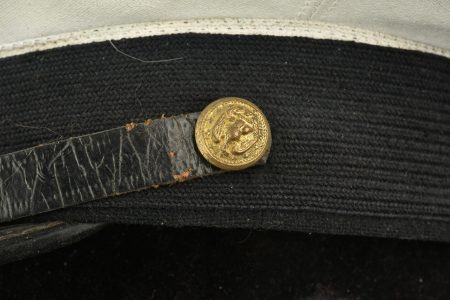 Casquette de l’US Navy. Coiffe en tissu imperméabilisé blanc. Bandeau en mohair noir. Insigne métallique USN. Fausse jugulaire présente. Visière vernie. Bandeau de sudation partiellement décousu, marquée Zephyr. Mica présent. A noter une certaine usure et patine de la pièce, ainsi que des tâches. Etat II+.