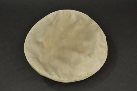Casquette de l’US Navy. En tissu coton gris. Bandeau en mohair noir. Insigne de l’US Navy en métal fortement oxydé. Fausse jugulaire présente, maintenue par deux boutons USN fortement oxydés. Visière en cuir craquelée. Bandeau de sudation en cuir marron, partiellement décousu. Mica présent. Etiquette du tailleur Régulation US Navy Cap. A noter une certaine usure et patine de la pièce. Etat II+.