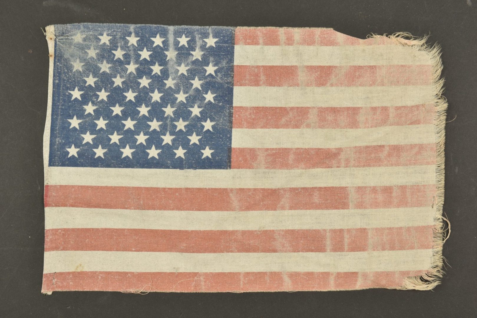 Drapeau US. Modèle imprimé à 50 étoiles. Biface. Fortement décoloré par le soleil, et effiloché. A noter une certaine usure et patine de la pièce. Etat II+.