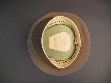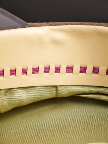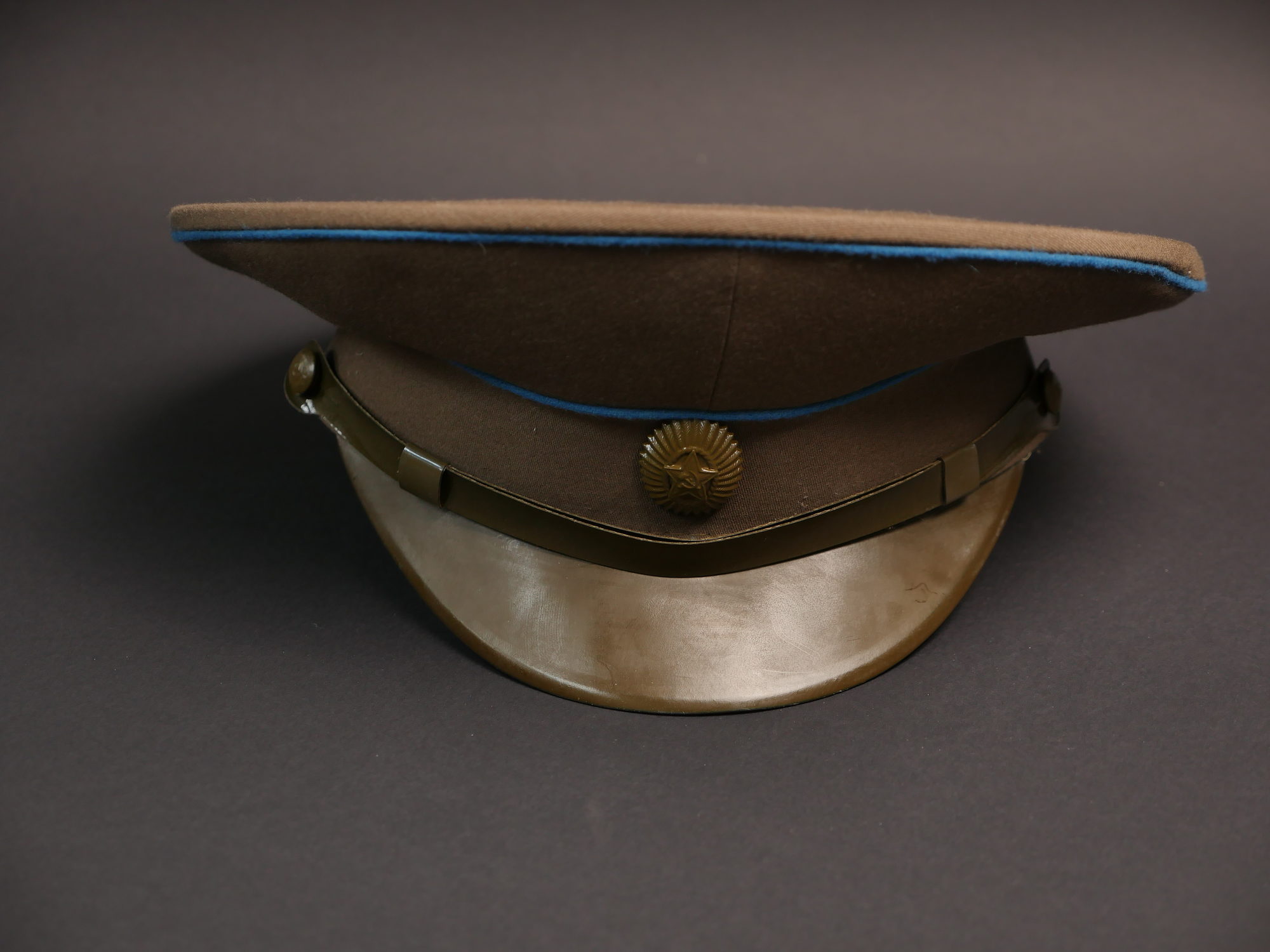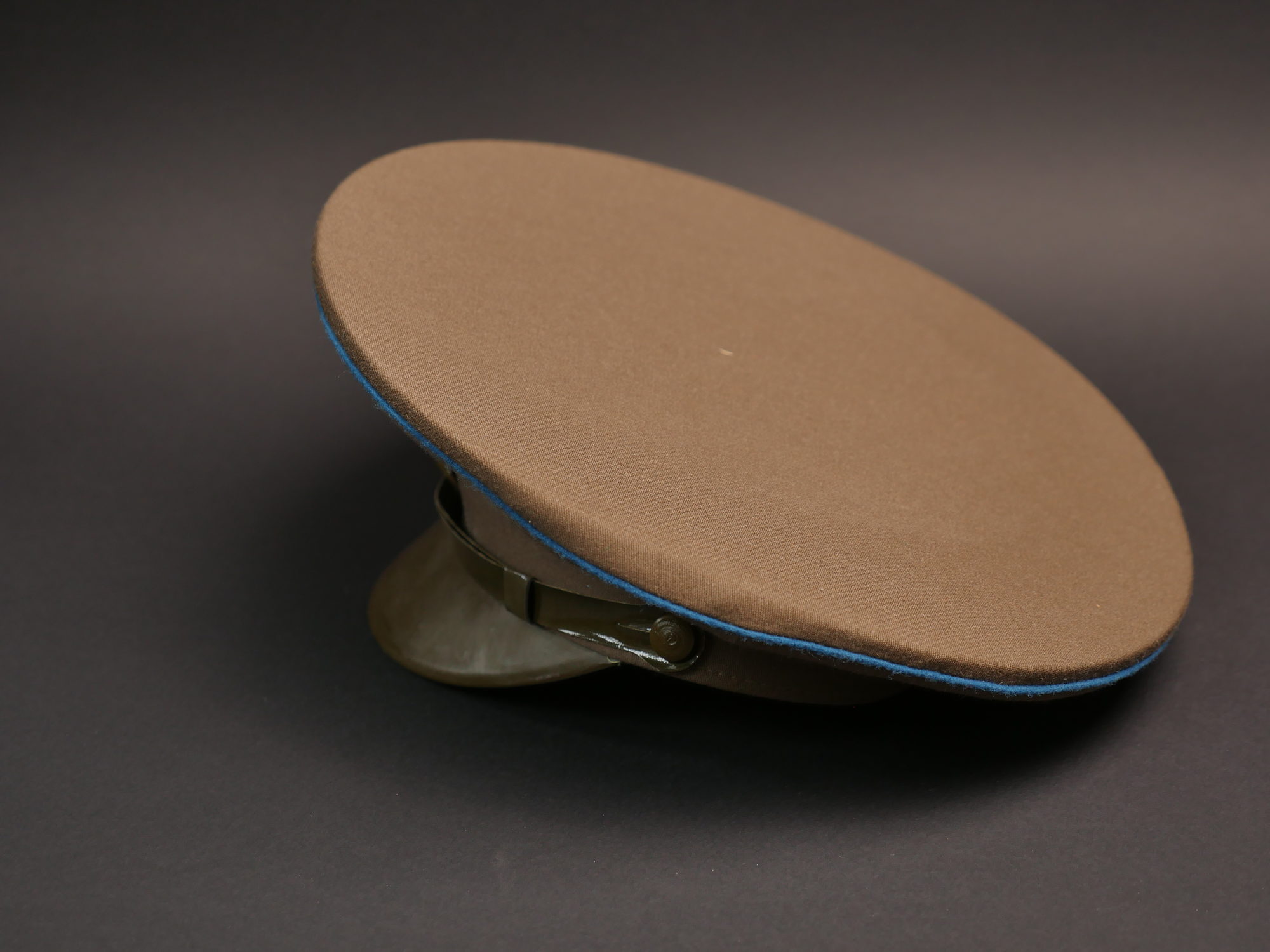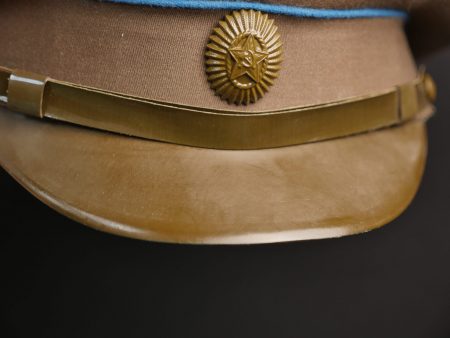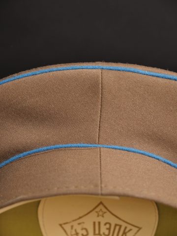 Casquette URSS. En gabardine kaki. Liseré bleu. Visière kaki. Fausse jugulaire présente. Insigne URSS en plastique kaki. Logo du fabricant présent, taille 60, datée Moscou 1984. A noter une... en savoir plus