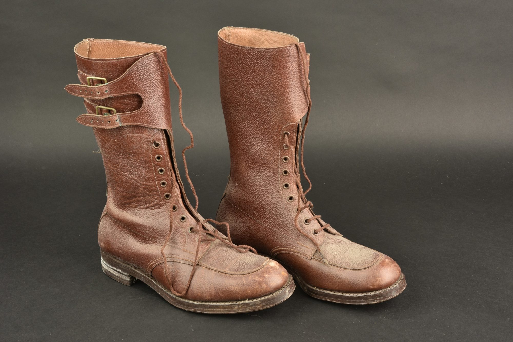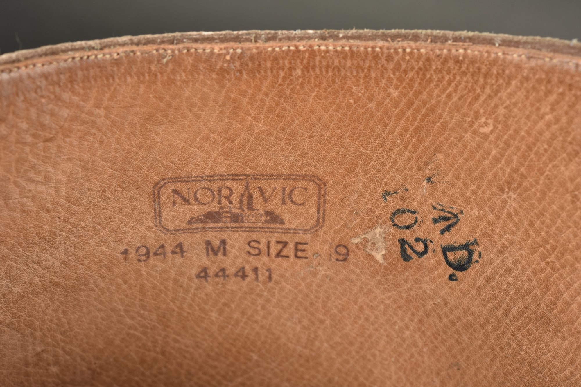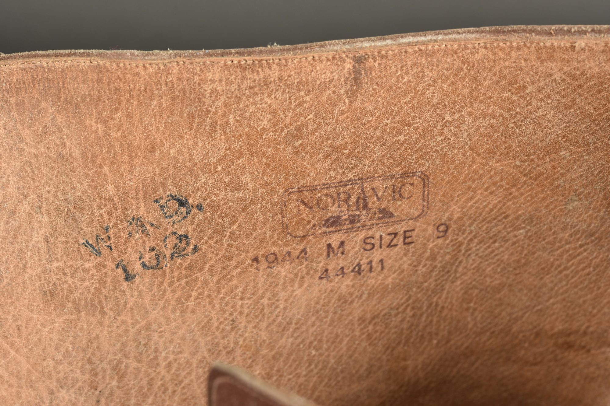 Bottes d’officier britannique. En épais cuir grenelé marron. Neuf œillets de laçage, les lacets sont présents. Jambière attenante fermant par deux brides. Semelles et talons en cuir, marquages 9M avec flèche du War Department. Marquages Norvic 1944 M, taille 9 44411. Approximativement une pointure 43/44 française.